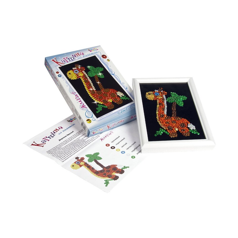 От собственного симпатичного, блестящего во всех смыслах жирафа, созданного для Вас известным художником Андреем Копыриным, Вас отделяют 436 пайеток шести цветов и несколько вечеров интересного, увлекательного занятия. Эта красочная картина создается на плотной черной бумаге, вставленной в рамку размером 26 на 18 сантиметров. По степени сложности вполне подходит для первой попытки собрать картину из пайеток. Эта и множество других картин из паеток, различных по степени сложности можно купить в интернет магазине производителя развивающих игр Десятое Королевство, оформив доставку в любую точку России.