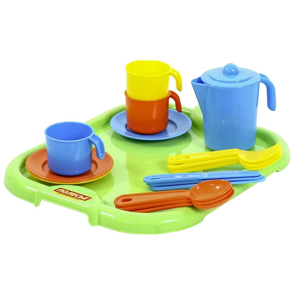 Игрушечная посудка для детей. Ею можно играть дома или в песочнице. Посудка выполнена из качественной пластмассы, все материалы абсолютно безопасны для детей. На приборах нет острых деталей, все они закруглены. В комплекте чашечки, блюдечки, ложки, вилки и ножи на 3 персоны, а еще в комплекте есть поднос - всю посуду можно разложить на подносе. Набор игрушечной посуды весь выполнен в разных цветах - желтый, оранжевый, зеленый и синий.