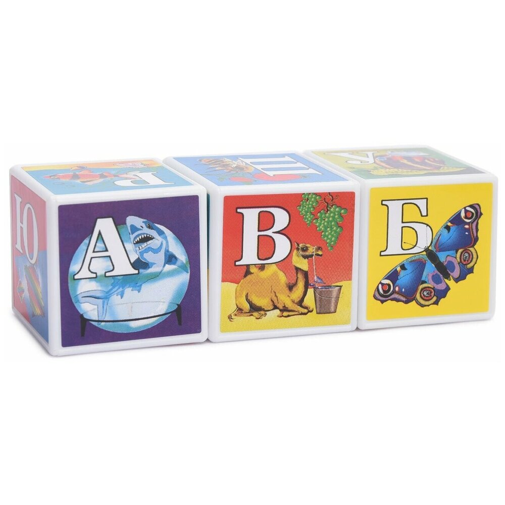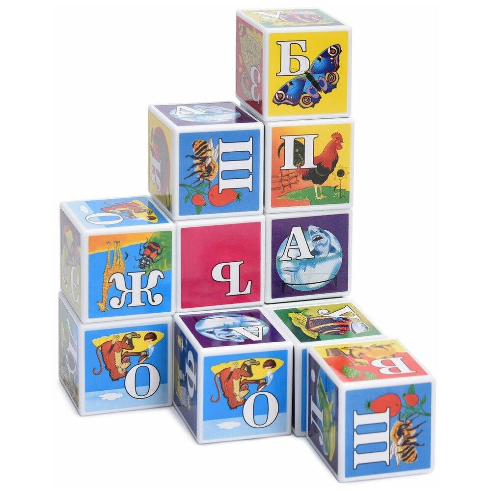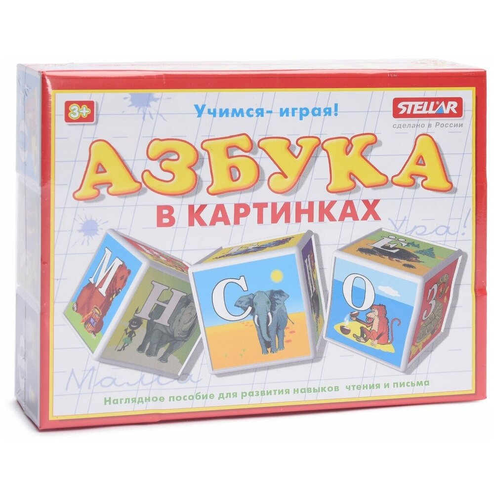Для миллионов малышей кубики стали одной из самых первых игрушек. Обучающие кубики Азбука в картинках научит вашего малыша алфавиту. Кубики сделаны из полистирола, пустотелые внутри и поэтому очень легкие. Грани размером 4×4 см, на которые наклеены яркие картинки с буквами. В наборе 12 кубиков. Игрушка развивает мелкую моторику, умственные способности и логику, память и внимание.
