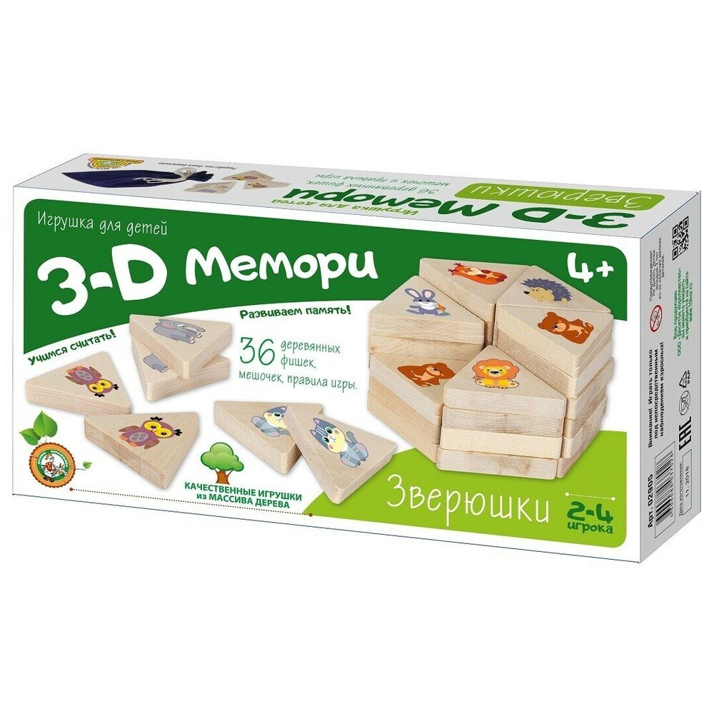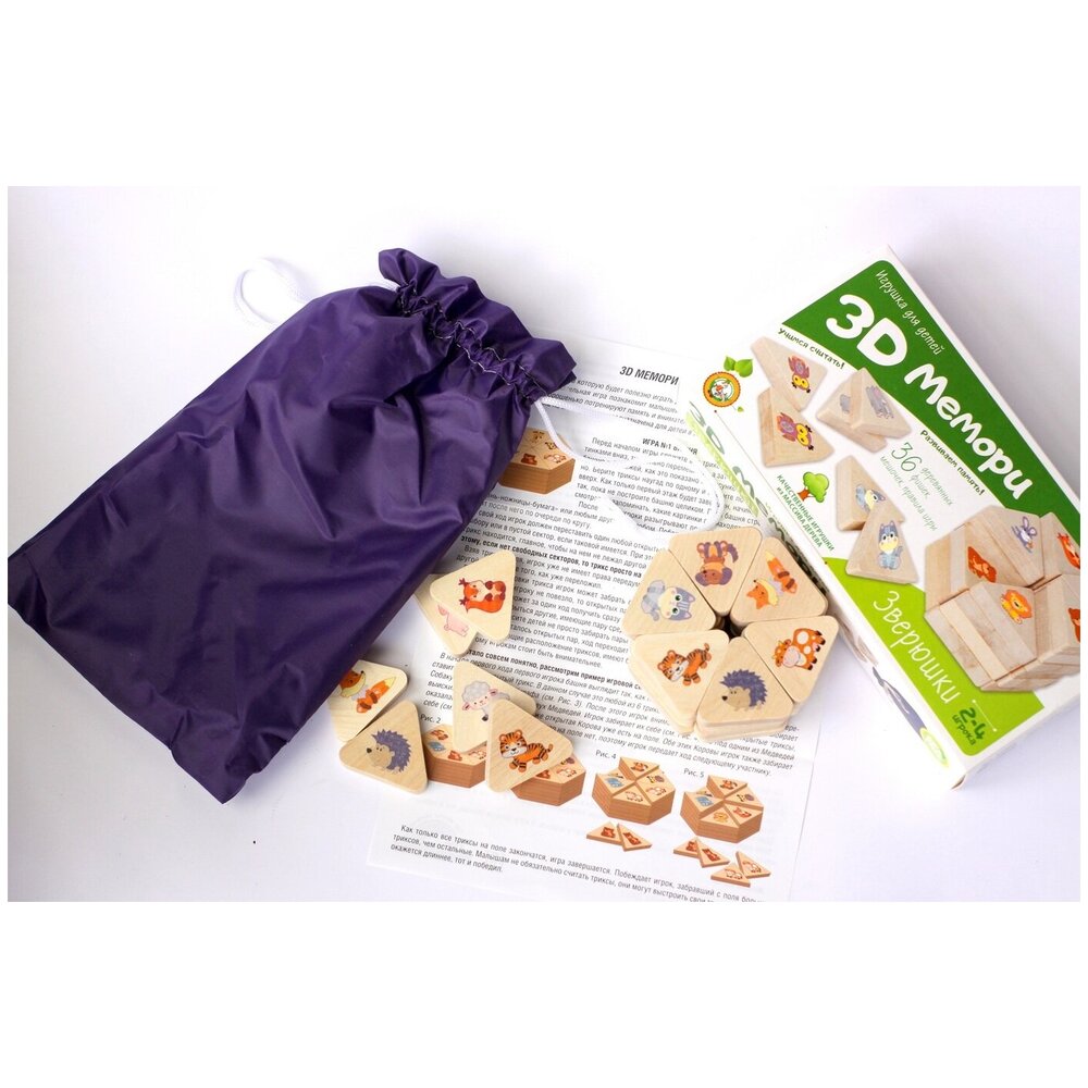 Если вы ищете игру, в которую будет полезно играть детям и интересно играть всей семьей, то вы ее нашли. 3D мемори "Зверюшки" - простая и увлекательная трехмерная игра познакомит малышей с 18 животными. Играя, дети запомнят их названия, внешний вид и хорошенько потренируют память и внимательность. Игра рассчитана на 2-4 игроков и предназначена для детей в возрасте от 4 до 9 лет и их родителей. Автор: Олеся Емельянова. В составе: • 36 деревянных фишек с гранями по 5см; • мешочек; • правила игры.