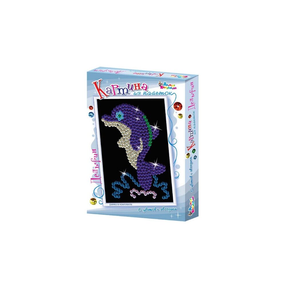 Рукоделие – очень увлекательное и весьма полезное занятие. Оно может принести немалую пользу маленькому человечку, привив ему вкус к созданию необычных вещей своими руками, развив усидчивость и аккуратность. Отличным вариантом для детского творчества могут стать аппликации из паеток. Создавать их могут и девочки, трепетно относящиеся ко всему красивому и необычному, и мальчики, подобрав соответствующий «мужской» сюжет. А почему нет? Этот вид прикладного искусства не имеет ярко выраженной гендерной принадлежности. И оригинальная картинка, созданная руками талантливого мальчика, может стать отличным подарком маме. В комплект входит пенопластовая основа-планшет, фон с уже нанесенными цветными точечками, набор паеток необходимых цветов и гвоздики для крепления. Следуя инструкции, ребенок сумеет создать аппликацию замечательного дельфина, которая станет отличным украшением его комнаты.