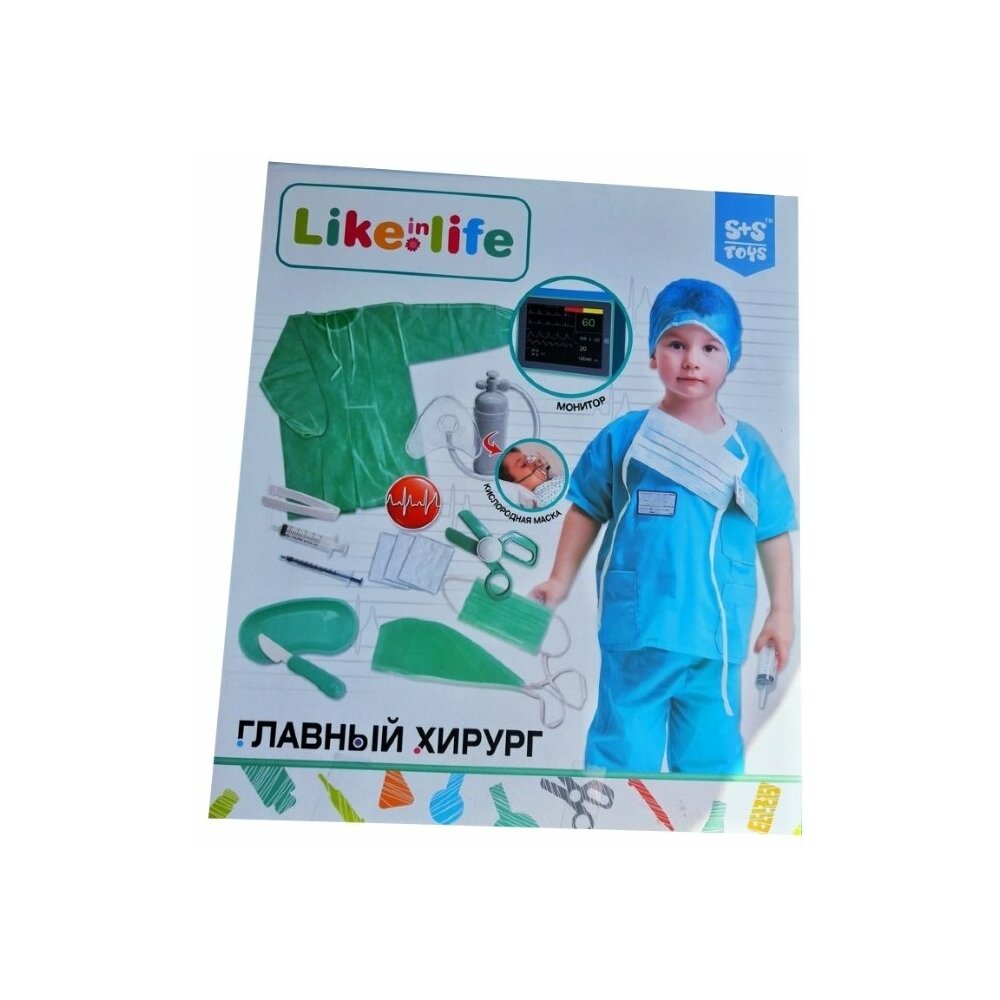 - Комплектация - халат;<br/> - маска;<br/> - шапка;<br/> - шприц;<br/> - кислородная маска;<br/> - баллон;<br/> - тканевые тампоны;<br/> - нож;<br/> - ножницы;<br/> - медицинский лоток;<br/> - экран с показателем пульса;<br/> - пинцет.