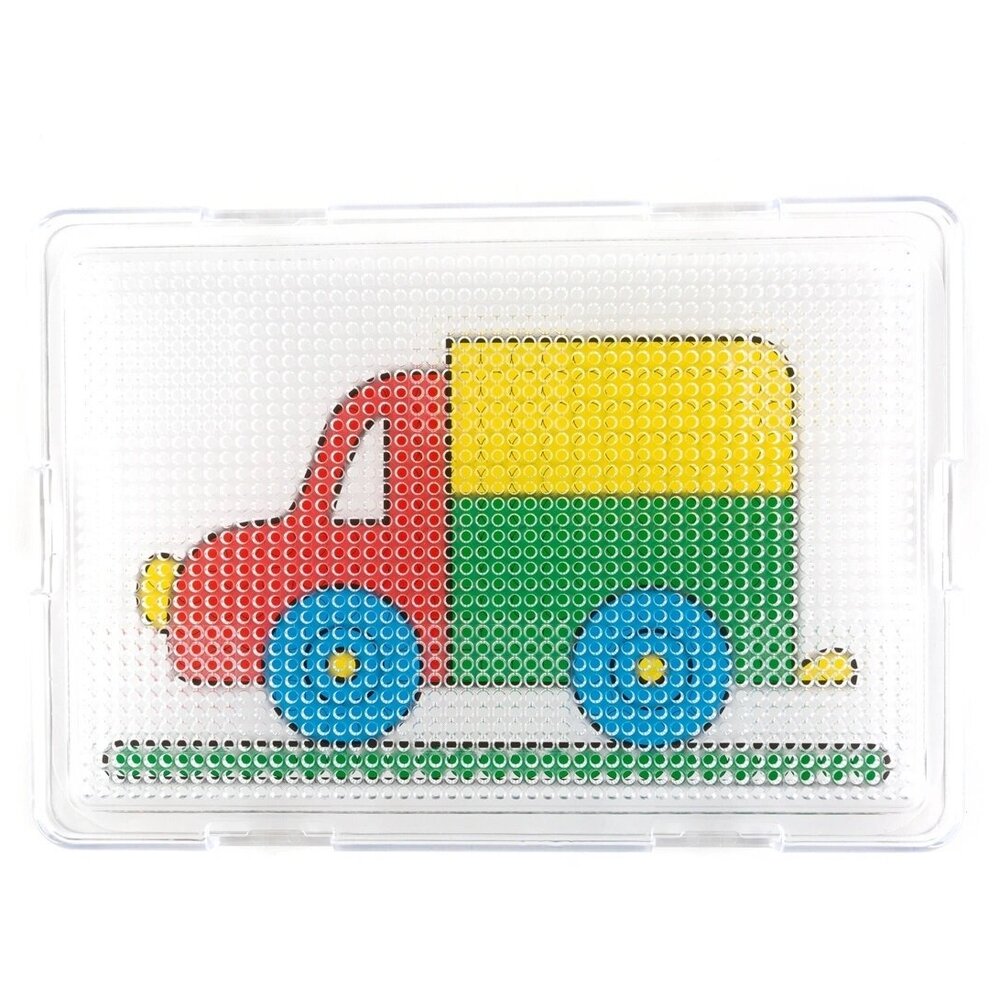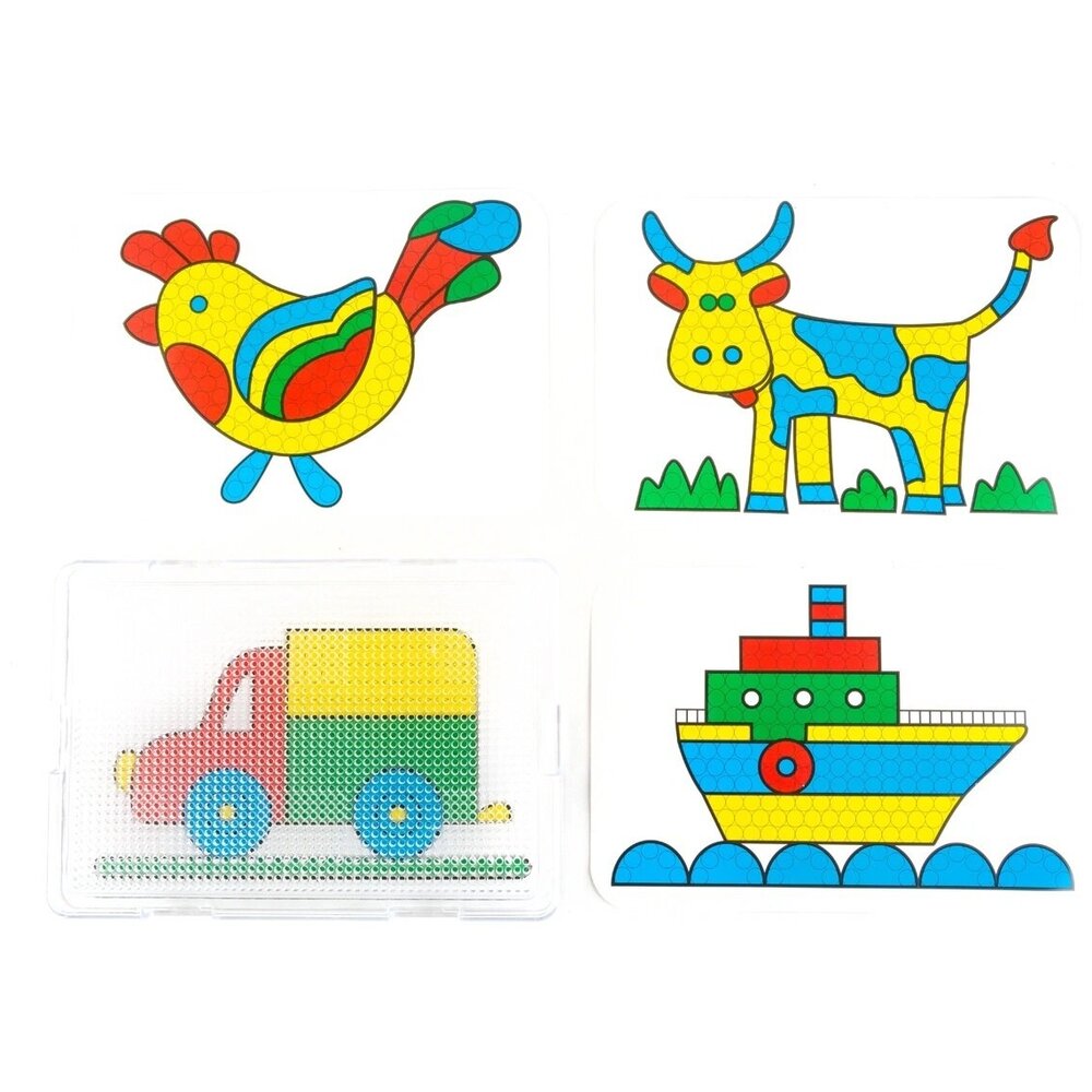 Набор мозаика с картинками «d10» состоит из картинок-шаблонов, прозрачного игрового поля и 275 разноцветных фишек-гвоздиков. Шаблон подскажет ребенку, какую фишку использовать и на какое место ее прикрепить. Освоив такой способ собирания мозаики, вы можете убрать картинки-подсказки.