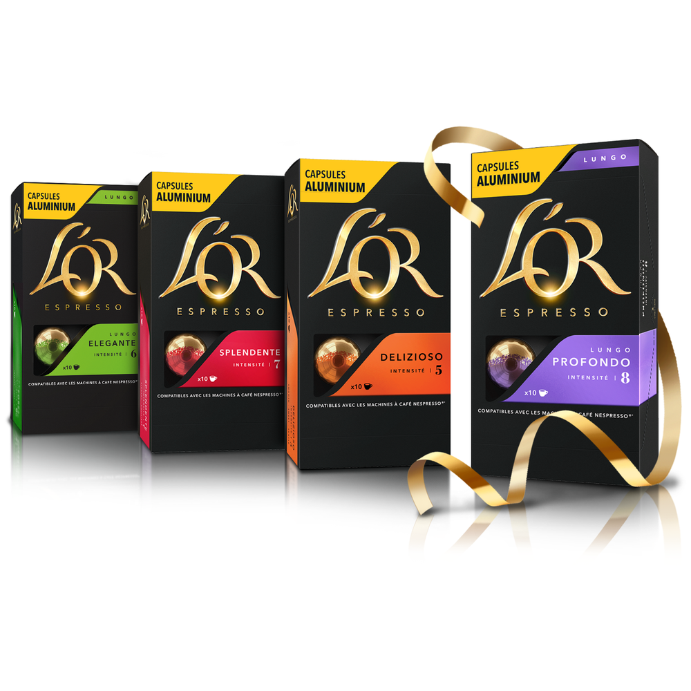 - Состав набора Espresso Lungo Elegante 10 шт. Espresso Splendente 10 шт. Espresso Delizioso 10 шт. Espresso Lungo Profondo 10 шт.
