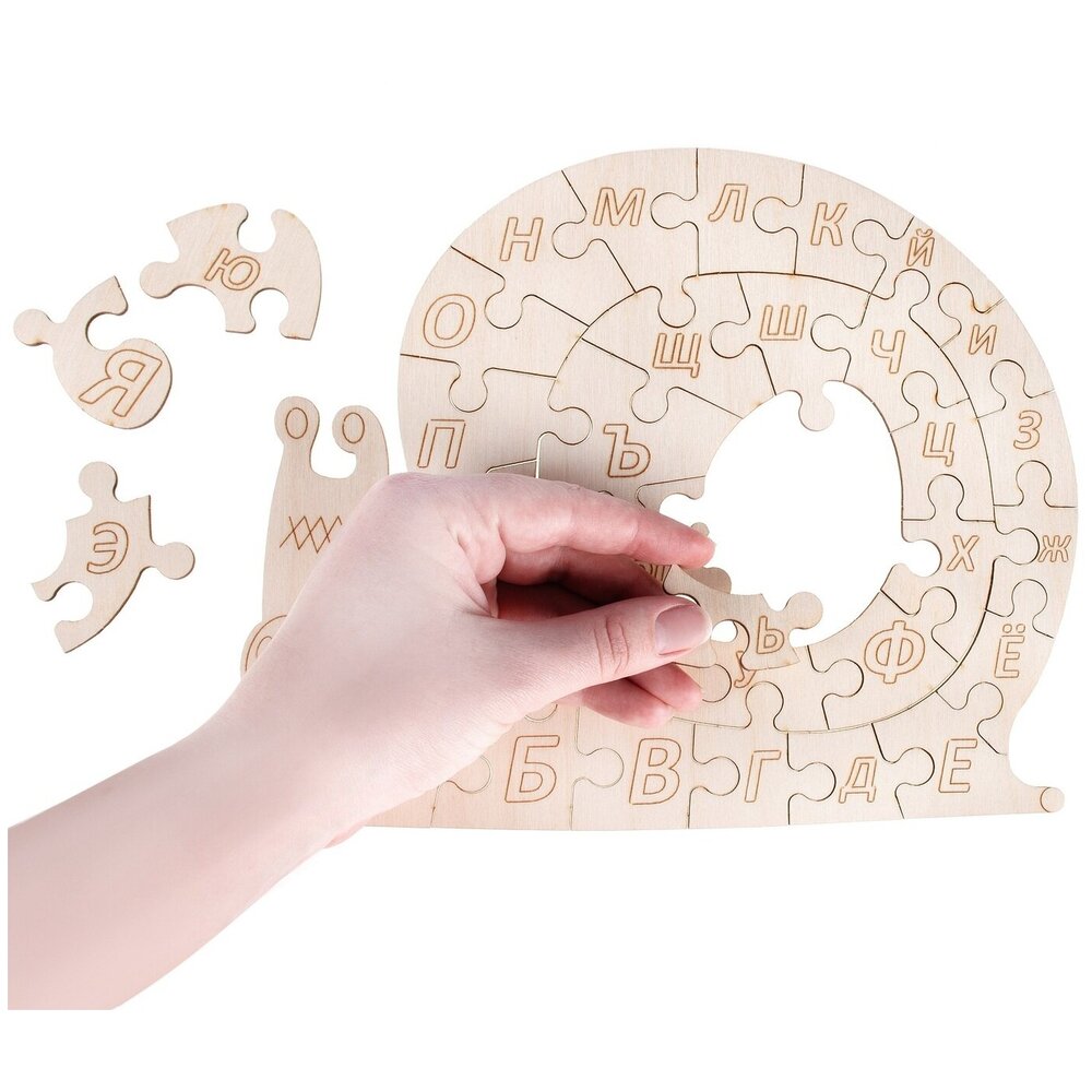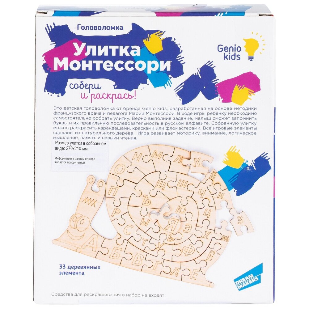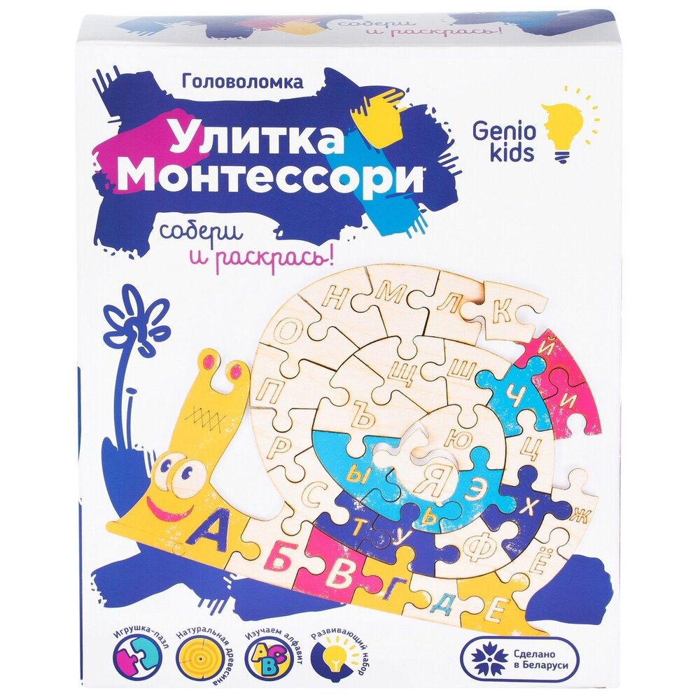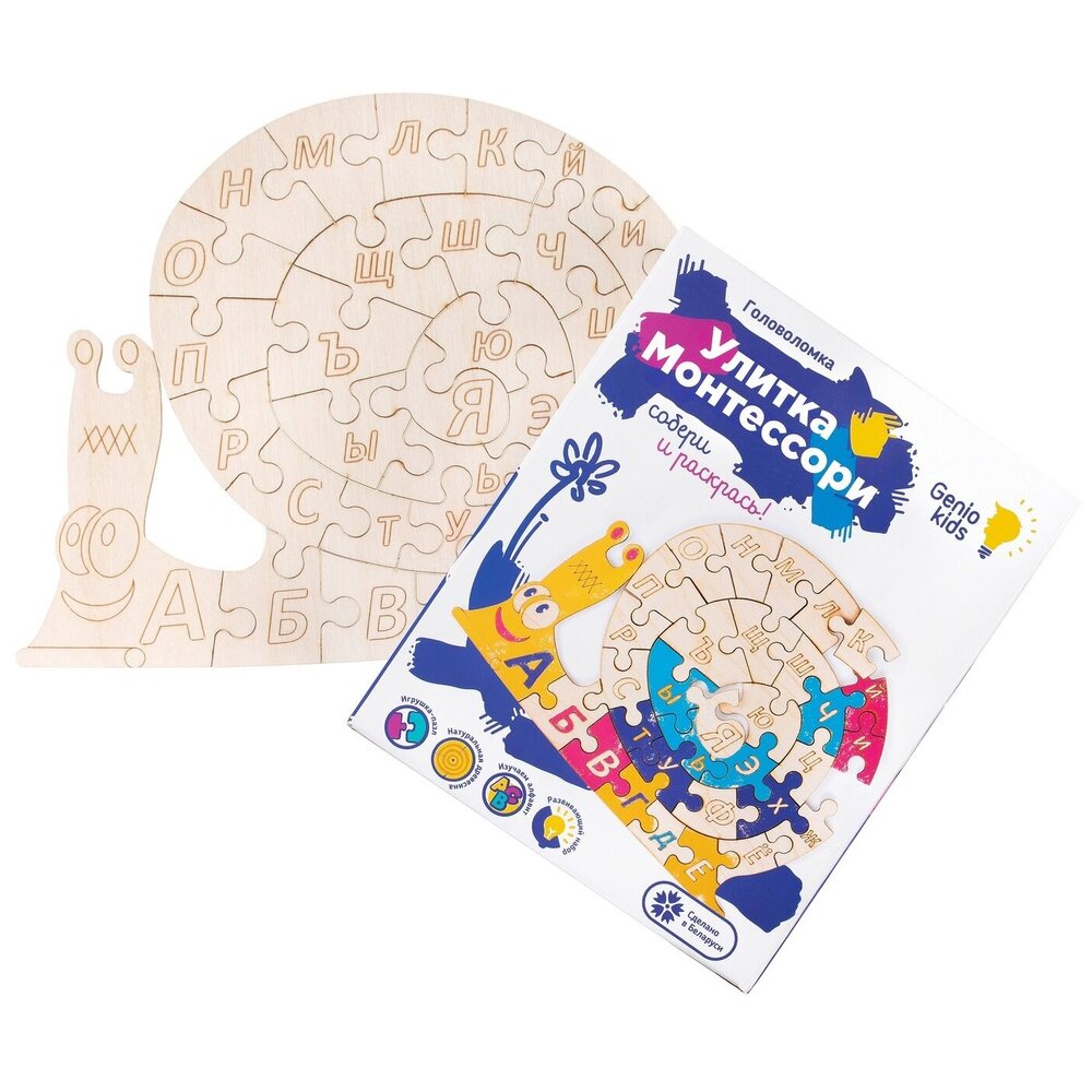 Представляем вам развивающий деревянный пазл от бренда Genio kids, разработанный на основе методики французского врача и педагога Марии Монтессори. В ходе игры ребёнку необходимо самостоятельно собрать улитку. Верно выполнив задание, малыш сможет запомнить буквы и их правильную последовательность в русском алфавите. Собранную улитку можно раскрасить карандашами, красками или фломастерами. Все игровые элементы сделаны из натурального дерева. Игра развивает моторику, внимание, логическое мышление, память и навыки чтения. Размер улитки в собранном виде: 210 на 270 см. Внимание! Средства для раскрашивания в набор не входят.