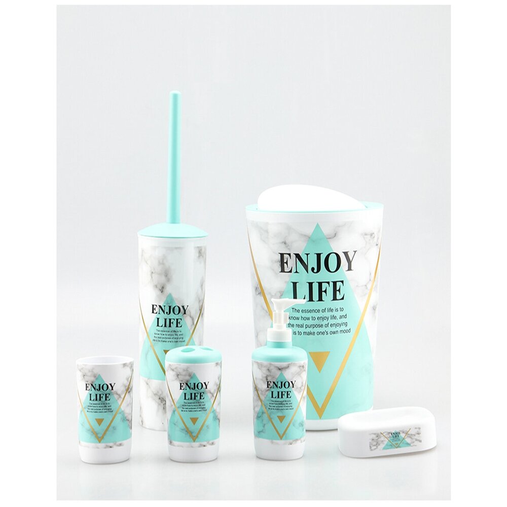 Функциональный набор для ванной комнаты Sanitaryware 68. Включает 6 предметов: мусорное ведро, ершик для туалета с контейнером, стакан для зубных щеток, стакан для воды, дозатор для жидкого мыла и мыльницу для кускового мыла. Набор изготовлен из пластика с оригинальным рисунком, который придаст интерьеру Вашей ванной комнаты уют и гармонию, и позволит оформить интерьер в едином стиле.