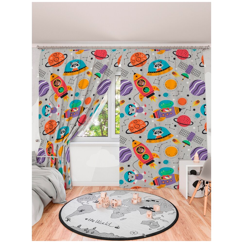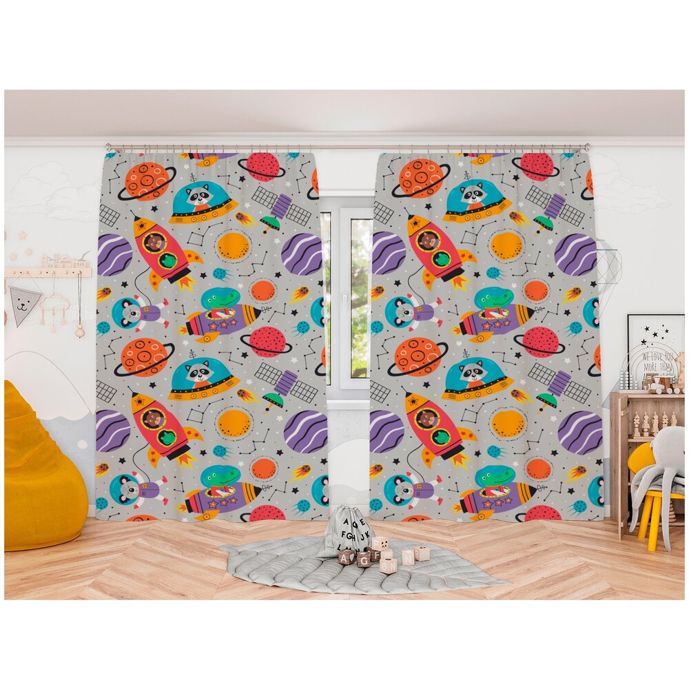Комплект штор LeJoy Home для детской"Мультяшные животные в космосе на сером фоне" 290х250см из габардина.
