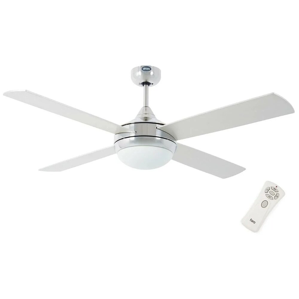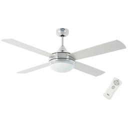 Люстра-вентилятор потолочный, лопасти двухсторонние, которые можно устанавливать нужным цветом вниз. Предназначен для беззвучного охлаждения воздуха в помещении летом и для рекуперации теплого воздуха зимой (есть функция реверс). Подходит для качественного потолочного освещения за счет светильника на 2 лампы с цоколем Е27. Устройство имеет три скорости вращения, управляется пультом ДУ, который входит в комплект. При установке потолочного вентилятора важно соблюдать правило: расстояние от пола до лопастей должно быть не менее 2,3 метра. Эффективен для 15-25 кв м площади. Размер лопастей 132 см, высота 41,5 см.