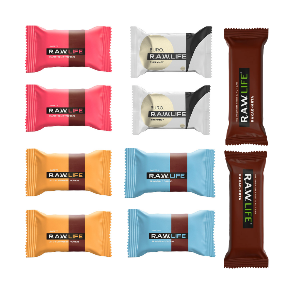 Конфеты и батончик Raw Life в одном наборе: Конфета "Апельсиновый трюфель" - 2 шт.*18г, Конфета "Трюфель с солью" - 2 шт.*18г, Конфета "Тирамису" - 2 шт.*18г, Конфета "Малиновый трюфель" - 2 шт.*18г, Батончик "Какао-мята"- 2 шт.*47г