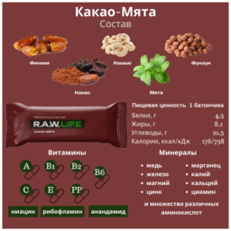 Трюфели R.A.W. Life изготовлены на основе 100% горького шоколада с добавлением кокосового масла, ягод, фруктов и фиников особого сорта. Один снэк - это всего 75 кКал, а значит, здоровая альтернатива сладостям для тех, кто ведёт активный и осознанный образ жизни. Все ингредиенты тщательно отбираются со всего мира: Австралии, Филиппин, Бразилии, Индии, Чили и России, поэтому вкусы трюфелей уникальные. Батончик "Какао-мята" Raw Life^ Чтобы получить это потрясающее сочетание, потребовалось 6 элементов. Энергетический батончик с мягким сладковатым кешью и крупными кусочками хрустящего фундука в оболочке из сладкой мякоти свежего финика восстановит ваши силы и поднимет настроение. Вы будете чувствовать себя бодрым и жизнерадостным в течение дня, благодаря природным энергетикам, содержащимся в какао-порошке. Нотку свежести этому батончику придает сушеная мята и мятный экстракт. Какао активирует работу головного мозга и стимулирует деятельность сердечно-сосудистой системы, понижая артериальное давление. Высокая калорийность кешью позволяет быстро утолить голод, а токоферол в его составе благотворно влияет на репродуктивную функцию мужчин и женщин. Этот батончик укрепит иммунную систему и восполнит запас фосфора в организме, сделает ваши зубы и кости крепкими и здоровыми.