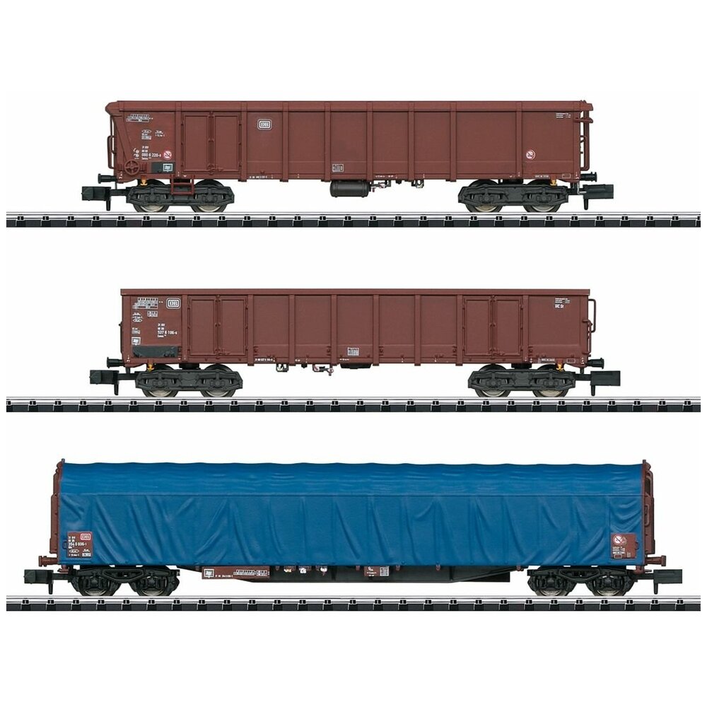 Немецкая компания TRIX широко известная по всему миру, изготавливает модели железных дорог, модели поездов, вагонов, и прочие дополнения, которые широко пользуются спросом и вызывают большой интерес как у опытных моделистов, так и у любителей. Качество моделей от компании TRIX безупречно! Модели выпускаются в двух форматах N и HO. Линейка моделей охватывает всю историю железнодорожного транспорта Германии и других европейских стран, обновляясь и идя в ногу с современным оснащением электропоездов. TRIX - позвольте себе быть увлеченным! Товарные вагоны Немецкой федеральной железной дороги. В наборе 3 вагона: грузовой вагон с прокатной крышей; полувагон, загруженный деревом; вагон со съемным брезентом. Общая длина по буферам: 320 мм. Масштаб: 1/160 N.