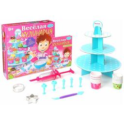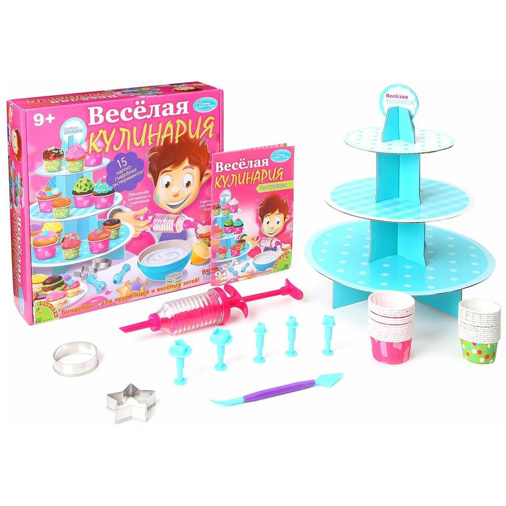 Научно-кулинарный набор «Веселая кулинария» – это целых 15 экспериментов, которые помогут ребенку освоить секреты кондитерского искусства, станут его верными помощниками на кухне и научат готовить любимые сладости. Теперь он сможет приготовить вкусные кексы, маффины, вуппи и многие другие сладости самостоятельно или же привлечь к кулинарному творчеству своих друзей. В наборе для юных кондитеров найдутся все необходимые инструменты и приспособления, которые пригодятся в процессе приготовления. Каждый сможет убедиться, что готовить удивительно вкусные сладости, следуя инструкции с яркими картинками, очень просто и необычайно весело! Благодаря «Веселой кулинарии» в доме поселится восхитительный аромат свежей выпечки и прекрасное настроение! В состав набора входят подставка для пирожных, кондитерский шприц с 8 насадками, 2 металлические формы для вырезания, 2 большие вырубки для марципана и сахарной пасты, 3 маленькие вырубки, 15 маленьких форм для капкейков, 15 больших форм для капкейков, кондитерский нож.