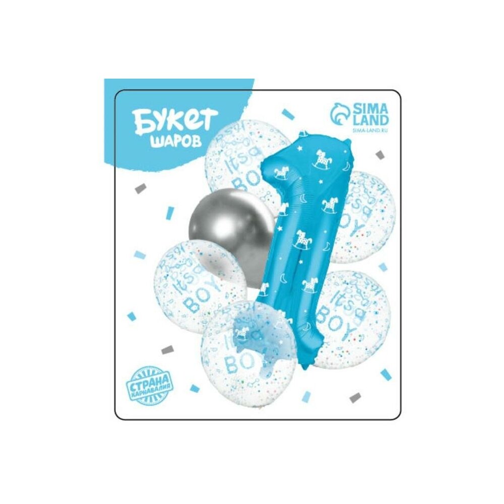 Букет из шаров "Ура, мне 1 год!" фольга, латекс, конфетти, голубой 7 шт. 7108025
