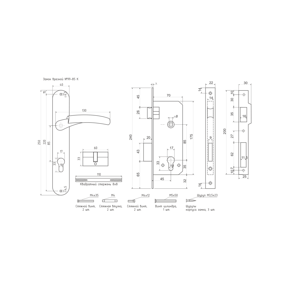 Замок врезной цилиндровый Нора-М 99-85 К комплект с ручками - Хром