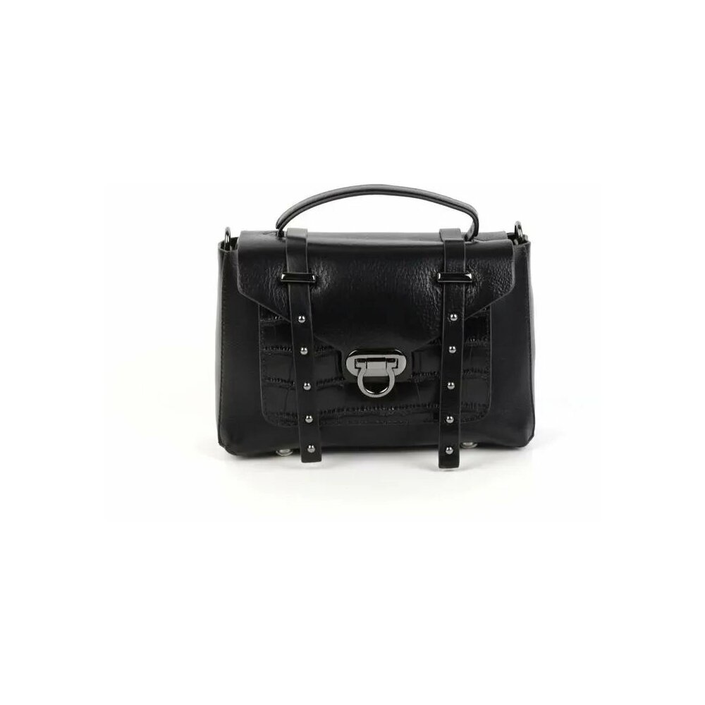 Женская каркасная сумочка из натуральной кожи черного цвета с вставкой из кожи под крокодила от Decorattra. Высота ручки 6см. Сумка закрывается на клапан с рамочным замком и на молнию. Под клапаном есть открытый карман. Внутри сумки одно отделение и боковые кармашки, один открытый и один на молнии. На дне сумки металлические ножки. В комплекте два наплечных ремешка.