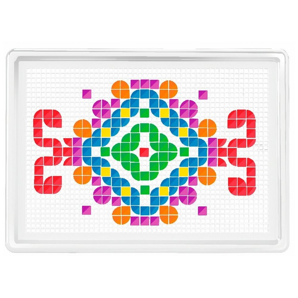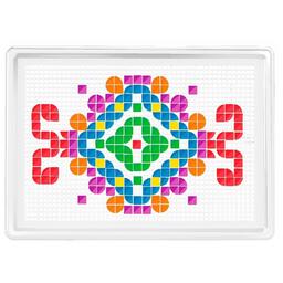 Мозаика с фишками геометрической формы широкой цветовой гаммы. Фишки сложены в удобный пенал-чемодан с двумя фиксаторами. Размер фишки — 9 мм. Шесть цветов — 528 фишек квадратной и треугольной формы. Картинки рекомендуется начинать собирать из примеров предложенных на упаковке.