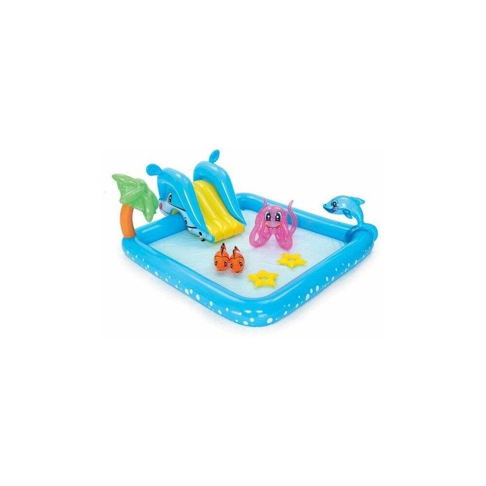 Игровой центр "Фантастический аквариум" с распылителем — удивительная игрушка. С ним ваш ребёнок никогда не заскучает. Яркий мини-аквапарк состоит из множества функциональных и интересных игрушек, которые по достоинству оценит кроха. Малыш может скатываться с водной горки, играть в надувные игрушки, кидать кольца и развивать меткость, загорать и плескаться в воде.