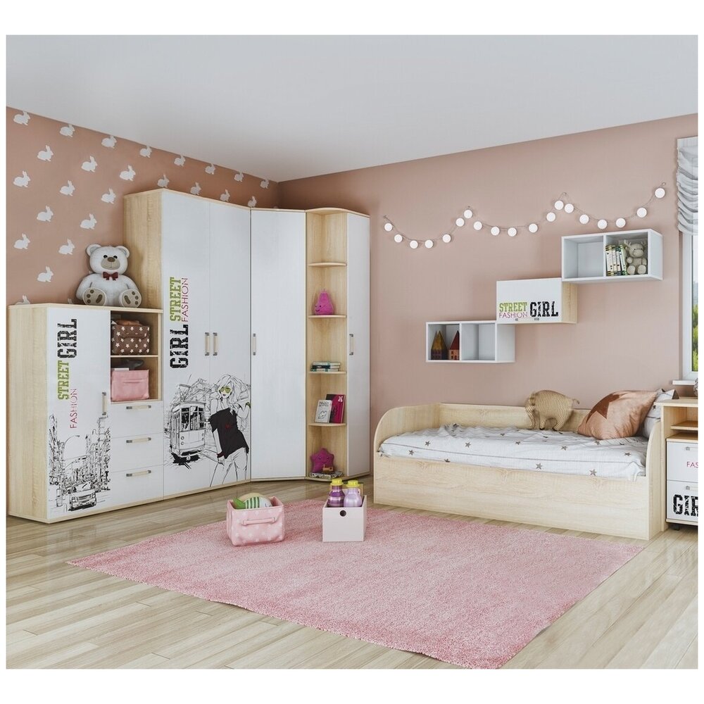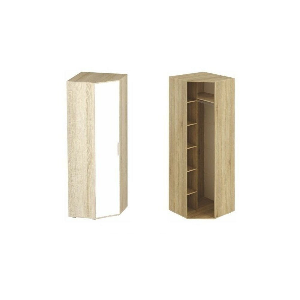 Вместительный угловой шкаф содержит обилие полок и хромированную штангу для одежды. Модуль данной модели универсален, собирается как на правую, так и на левую сторону. Размер ШхВхГ: 751х2176х751 мм. Цвет: сонома/белый