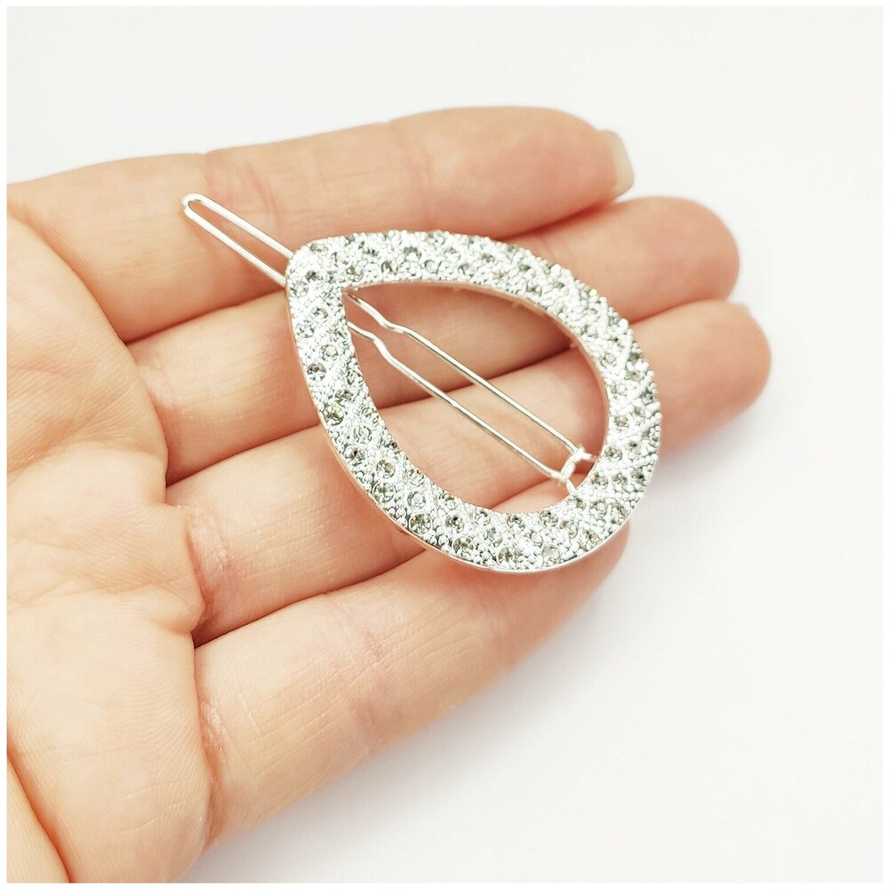Элегантная заколка для волос на каждый день, праздничное событие или свадебное торжество. Заколка металлическая серебристого цвета со стразами. Размер капельки 4,5х3,5 см.