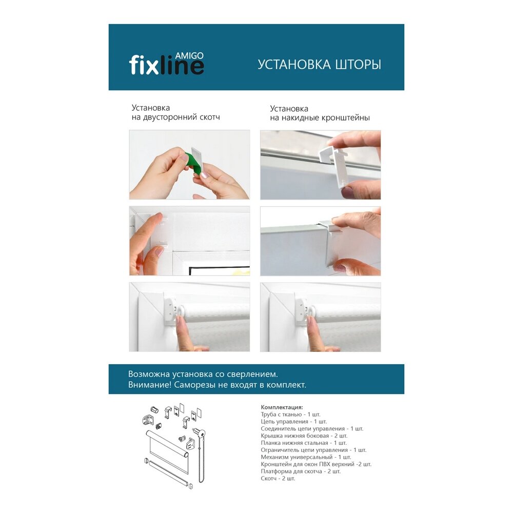 • Комплектация труба с тканью - 1 шт., цепь управления - 1 шт., соединитель цепи управления - 1 шт., крышка нижняя боковая - 2 шт., планка нижняя стальная - 1 шт., ограничитель цепи управления - 1 шт., механизм универсальный - 1 шт., кронштейн для окон ПВХ верхний -2 шт., платформа для скотча - 2 шт., скотч - 2 шт.
