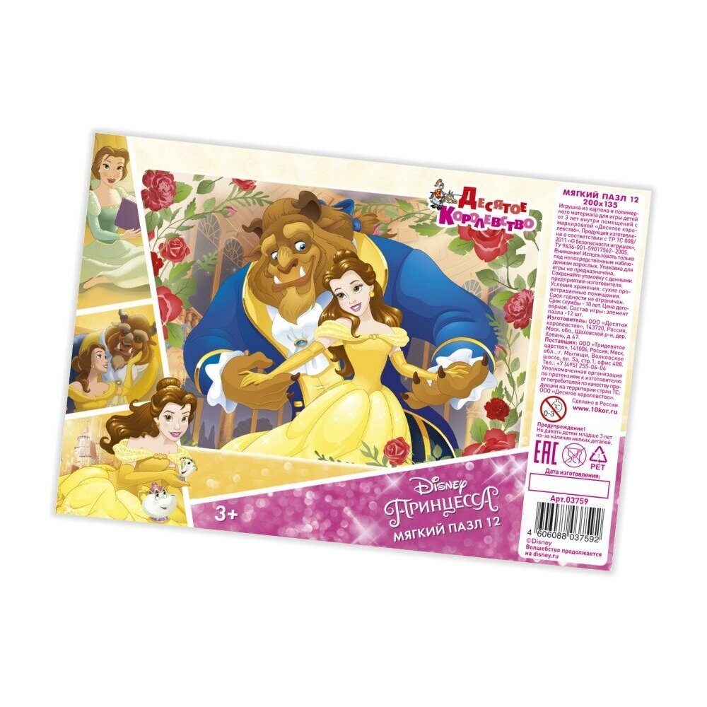 Собирайте яркие картинки с героями Disney вместе с мягкими пазлами от «Десятого королевства»! Пазл «Красавица и Чудовище» состоит из 12 мягких элементов, изготовленных из картона и полимерного материала. Элементы пазла имеют крупный размер (5х5 см.), чтобы ребёнок не смог проглотить их во время игры. Размер пазла в собранном виде – 20х13,5 см. Герои пазла «Красавица и Чудовище» – главные герои одноименного мультфильма Disney. Пазл предназначен для детей от 3-х лет. Игра с пазлом развивает логику и мелкую моторику рук малыша.