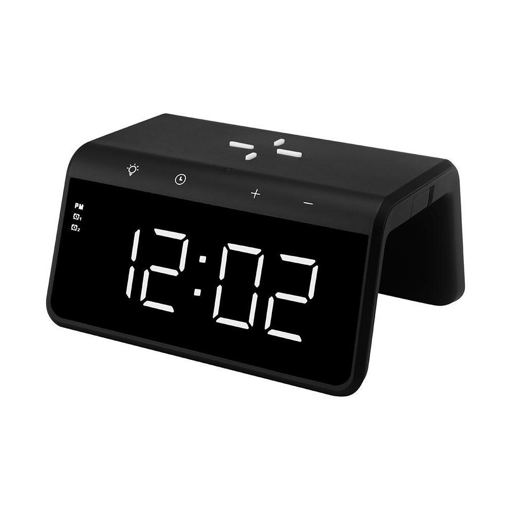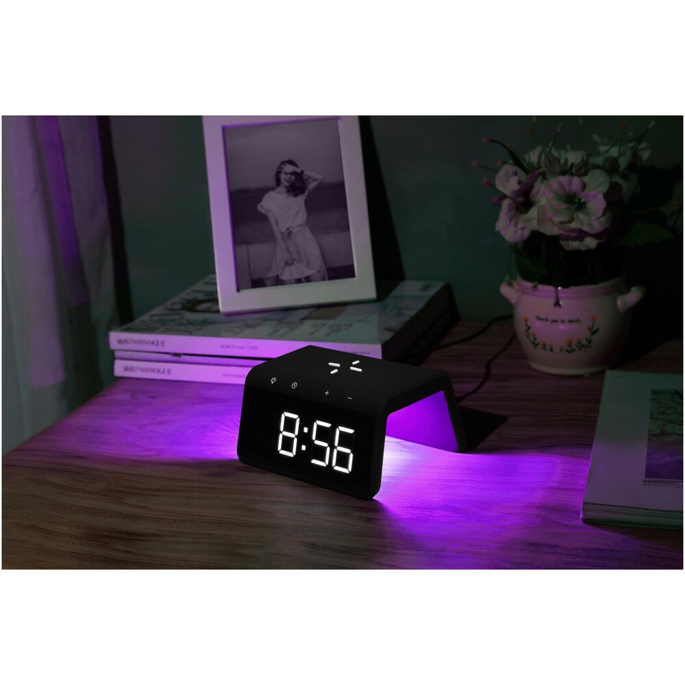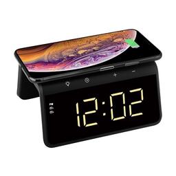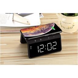 Докстанция с беспроводной зарядкой смартфона Особенности и набор функций: • RGB LED ночник-подсветка с 8 переключаемыми цветами • Функция быстрой беспроводной зарядки • Режим отображения времени в 2х режимах 12/24 • Функция диммера дисплея отображения времени • Дополнительный USB выход для проводной зарядки • Функция повторного срабатывания будильника • Сертификация QI, CE, ROHS, FCC, REACH