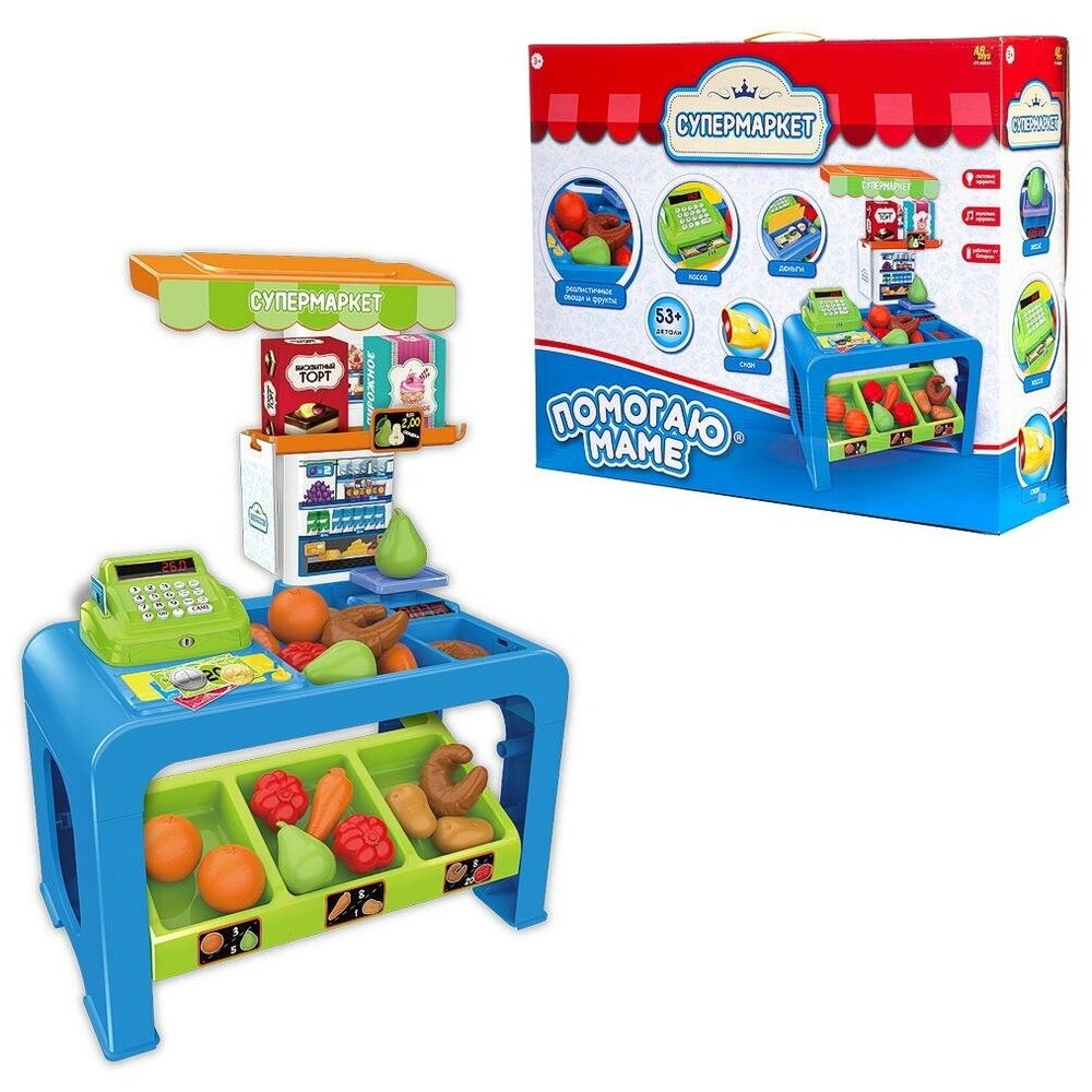 Супермаркет "Помогаю маме", в наборе с аксессуарами Комплектация (53 предмета): апельсин 3 шт., груша 3 шт., круассан 3 шт., картошка 3 шт., морковка 3 шт., перец 3 шт., бумажные деньги 12 шт., сканер, пакет, бумажная коробка 2 шт., монеты 10 шт., стол, полка для овощей, касса, кредитная карта, белая панель 2 шт., желтая панель, навес. Размер игрушки в собранном виде: длина 47см - ширина 28см - высота 65см (высота столика 30см). Световые и звуковые эффекты появляются при нажатии на кнопки кассы, а также при установки карты вертикально в прорезь считывающего устройства. Ящик кассы открывается кнопкой CASH.Работает от 3-х батареек типа АА, не в комплекте. Инструкция по сборке указана на упаковке. Упаковка: закрытая коробка с ручкой 57,9х47,7х14,9см.