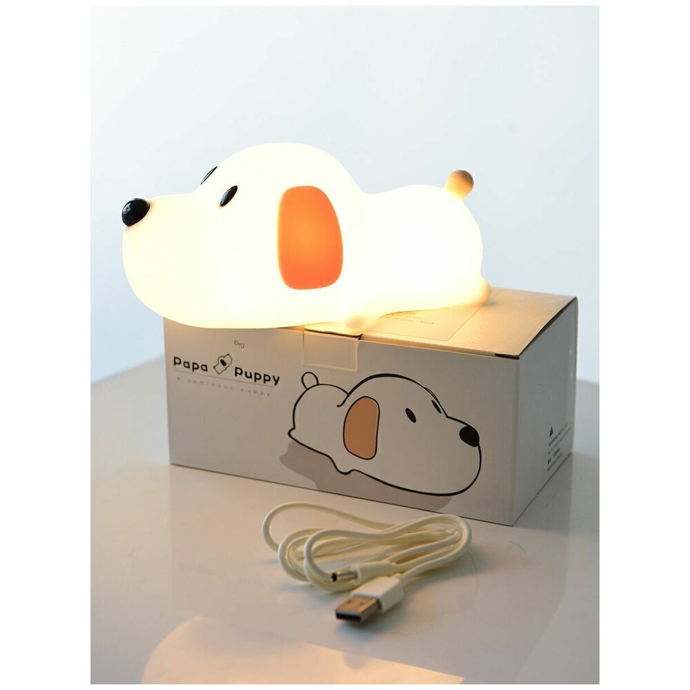"Силиконовый светильник антистресс, идеальный компаньон для вашего малыша во время сна. Милый друг щенок будет охранять сон вашего малыша. Установите таймер сна:30 мин или 60 мин и светильник сам погаснет когда ваш малыш заснет. Включается и выключается через касание носика собачки. Заряжается через USB шнур. Корпус ночника сделан из мягкого силикона, который делает светильник пружинистым. Малыш не поранится, ведь силикон мягкий и безопасный. Не разобьется при падении. Светильник имеет два типа свечения: теплый свет и холодный свет. Создает приятные ощущения при касании- песика хочется погладить и поиграть с ним как с игрушкой. Корпус из силикона не имеет запаха и безопасен для ваших детей. Светильник работает на аккумуляторе, его можно перемещать на любое место, не привязываясь к розетке. Положите собачку рядом с малышом на кроватку, это абсолютно безопасно благодаря современным светодиодам. Коробка ночника решит проблему с подарочной упаковкой"