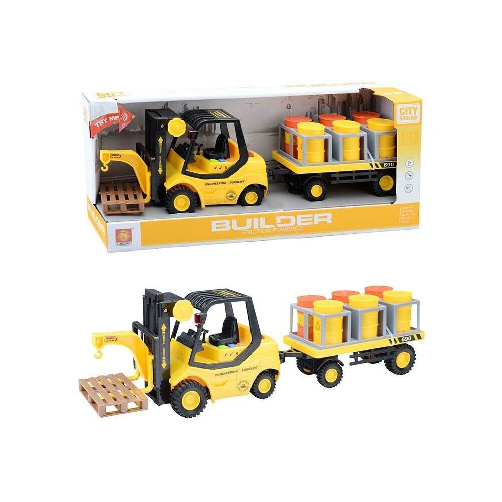 • В комплекте: автопогрузчик, тележка, поддон, 6 бочек, держатель для бочек. n• Габаритные размеры автопогрузчика: 23х9.5 х13.5 см. n• Габаритные размеры тележки: 19.5х8.5 х5.5 см. n• Размеры пластикового поддона: 8.7х5.5х1.7 см. n• Размеры бочки: 3.6х3.6х5.5 см. n• Масштаб: 1:16. n• Инерционный механизм. n• Колёса автопогрузчика и тележки с резиновыми покрышками. n• Ручной механизм управления грузоподъёмником. n• Световой эффект: мигающие лампочки. n• В кабине погрузчика 3 звуковые кнопки: n - запуск двигателя; n - сигнал заднего хода; n - клаксон. n• Свет и звук работают от 3 батареек AG13/LR44 (входят в комплект для демонстрации). n• Материал: пластик, элементы из металла. n• Соответствует требованиям безопасности продукции. n• Для детей от 3-х лет.