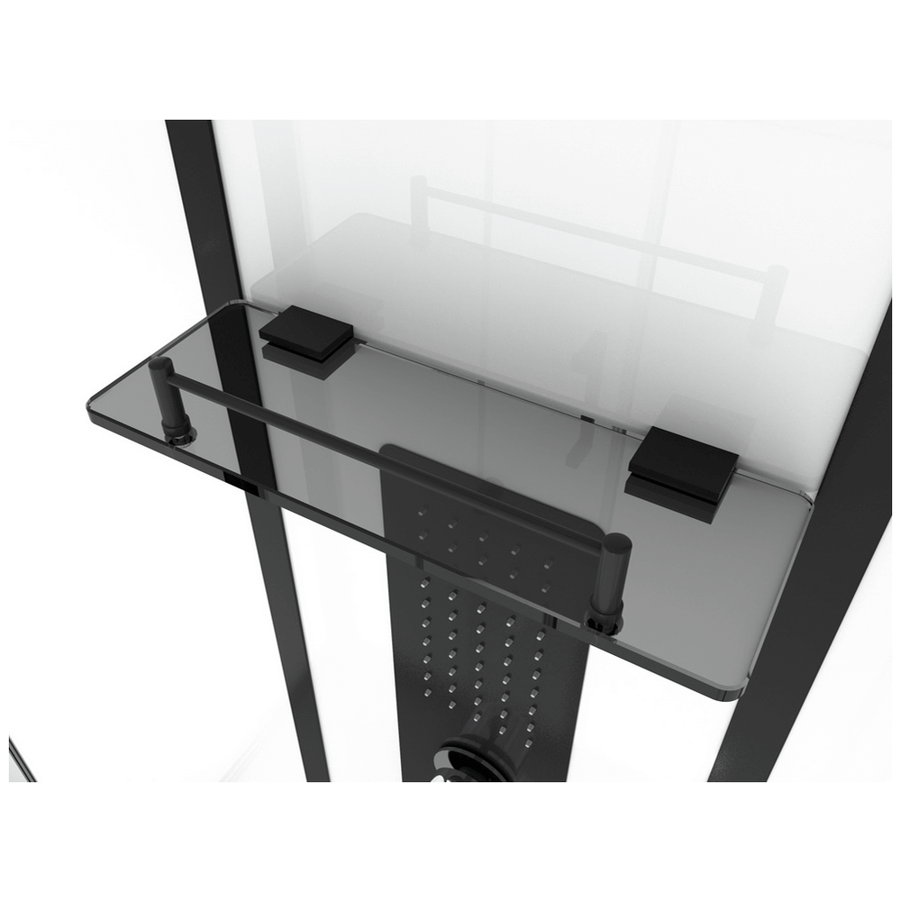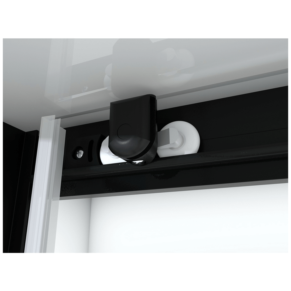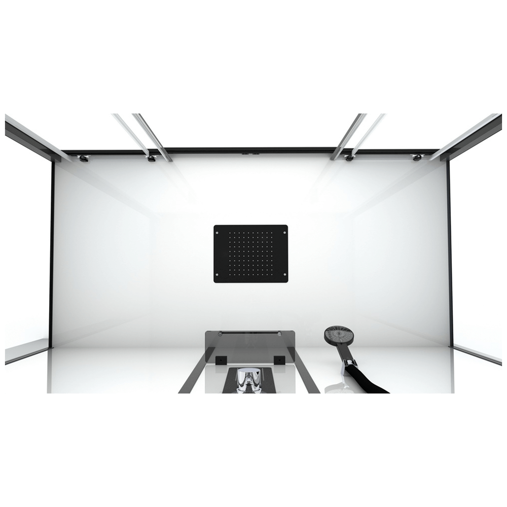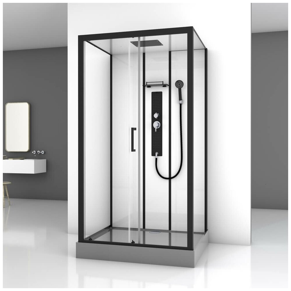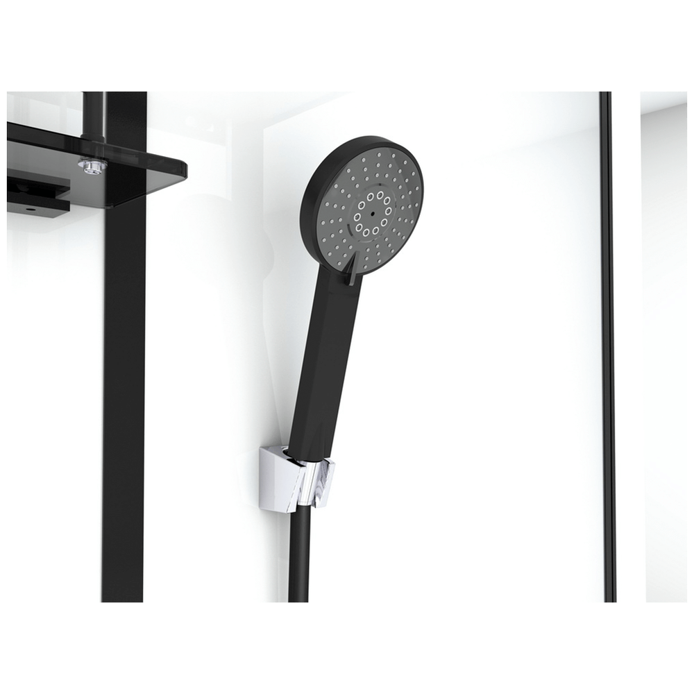 Стекло нового поколения «Super White» - белое стекло высочайшего качества, с применением в качестве исходного материала стекла Optiwhite от Pilkington (Англия). Верхний тропический душ. Ручной душ. Закаленное стекло 6 мм. Черный матовый профиль. Раздвижной тип дверей. Акриловый поддон в сером цвете высотой 150 мм. Усиленный гладкий шланг лейки. Надежные стальные ручки.
