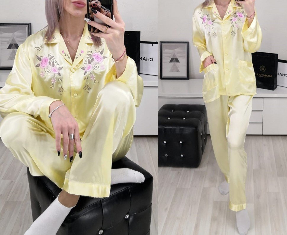 Пижама женская брюки и рубашка с цветочной вышивкой (Желтый, XS (40-42