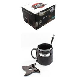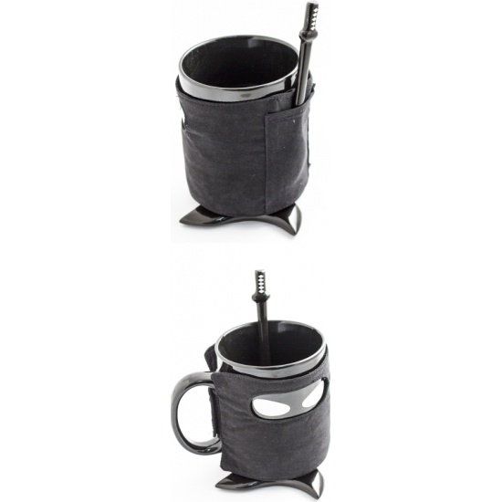 необычная глазастая кружка в тканевой чёрной маске, ложечка в виде