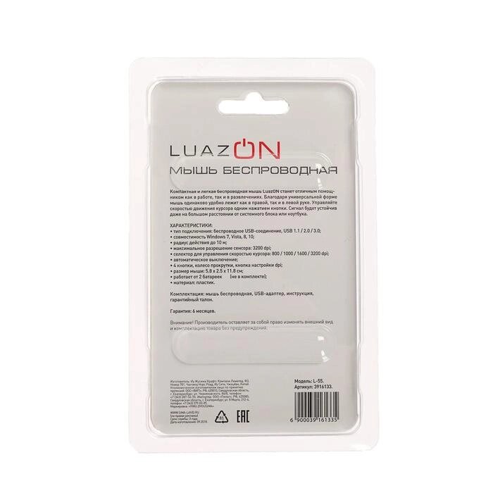 Мышь LuazON MB-1.1, беспроводная, оптическая, 3200 dpi, 2xAA (не в компл), USB, чёрная