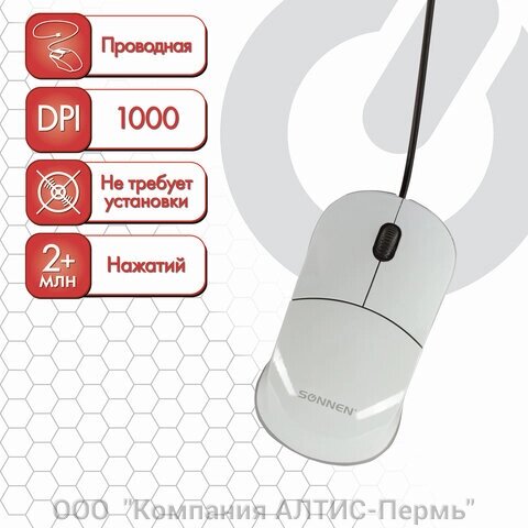 Мышь проводная SONNEN М-2241W, USB, 1000 dpi, 2 кнопки + 1 колесо-кнопка, оптическая, белая, 512634