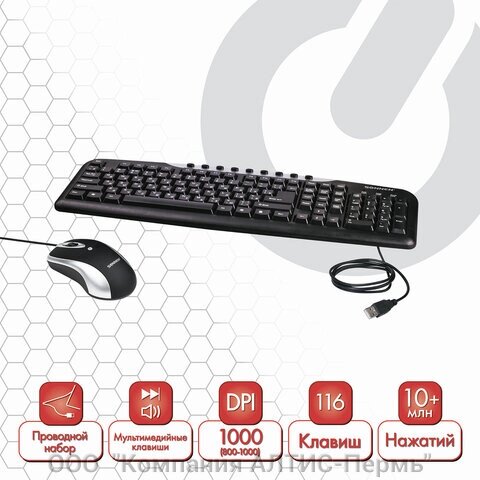 Набор проводной SONNEN KB-S110, USB, клавиатура 116 клавиш, мышь 3 кнопки, 1000 dpi, черный/серебристый, 511284