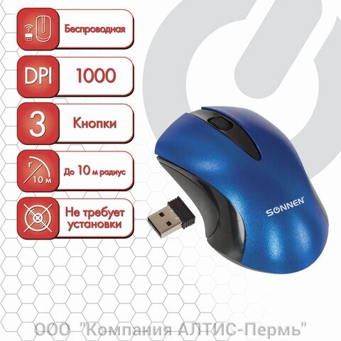 Мышь беспроводная SONNEN M-661Bl, USB, 1000 dpi, 2 кнопки + 1 колесо-кнопка, оптическая, синяя, 512648