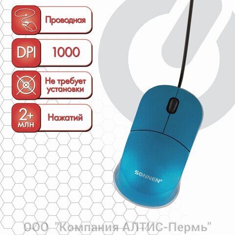 Мышь проводная SONNEN М-2241Bl, USB, 1000 dpi, 2 кнопки + 1 колесо-кнопка, оптическая, голубая, 512636