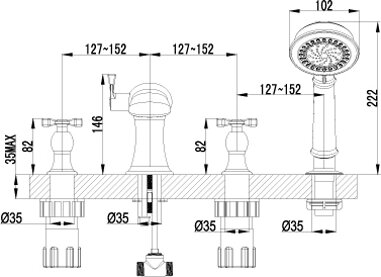 • Оснащение крепления, душевой шланг, душевая лейка, переключатель потоков