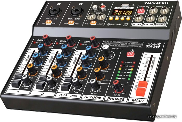 - Линейный аудиовход 4 (2 x XLR + 1/4" TRS - совмещены с микрофонными, 1 парный 1/4" TRS, 1 парный RCA)