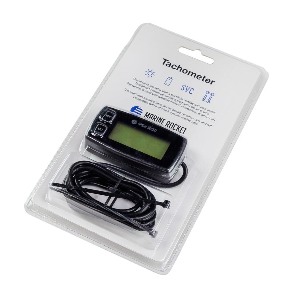 - Описание Универсальный тахометр с подсветкой дисплея и счётчиком моточасов.Предназначен для измерения числа оборотов двигателя и времени его работы.Используется только с бензиновым двигателем внутреннего сгорания.Подключается к свече зажигания двигателя, сигнальный провод наматывается вокруг свечного провода (5-6 витков).Длина сигнального провода 1.5 метра.Прибор крепится с помощью резьбовых шпилек.Класс защиты IP65 (пыленепроницаемый, брызгозащищённый).