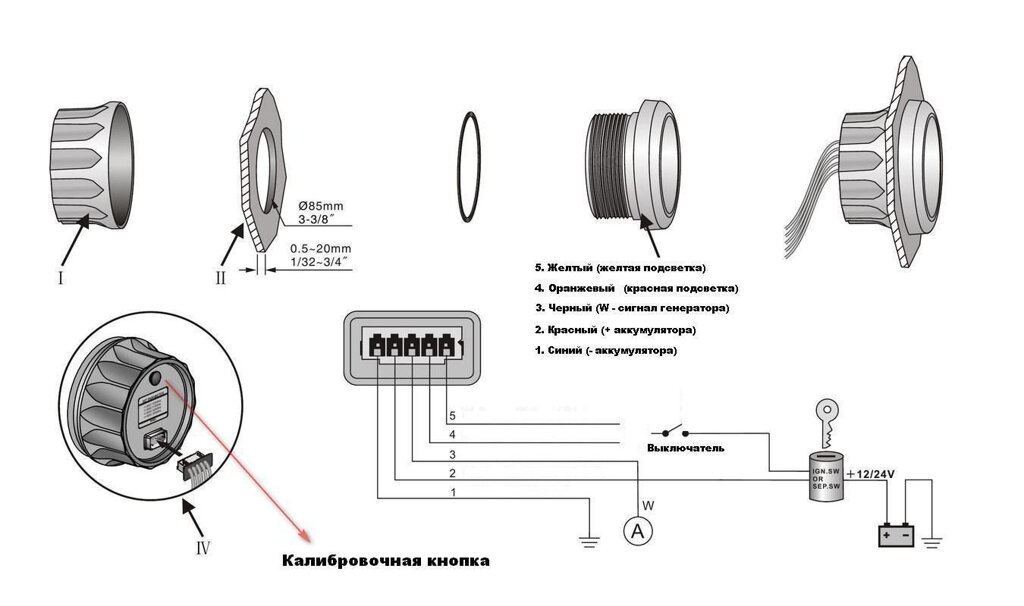 ПримечаниеПодсветка прибора может быть как красной так и желтой, цвет зависит от варианта подключения контактов.Сигнал на тахометр поступает в виде переменного тока с генераторной катушки двигателя. При отсутствии возможности подключения к генератору переменного тока потребуется установка отдельного сенсора.