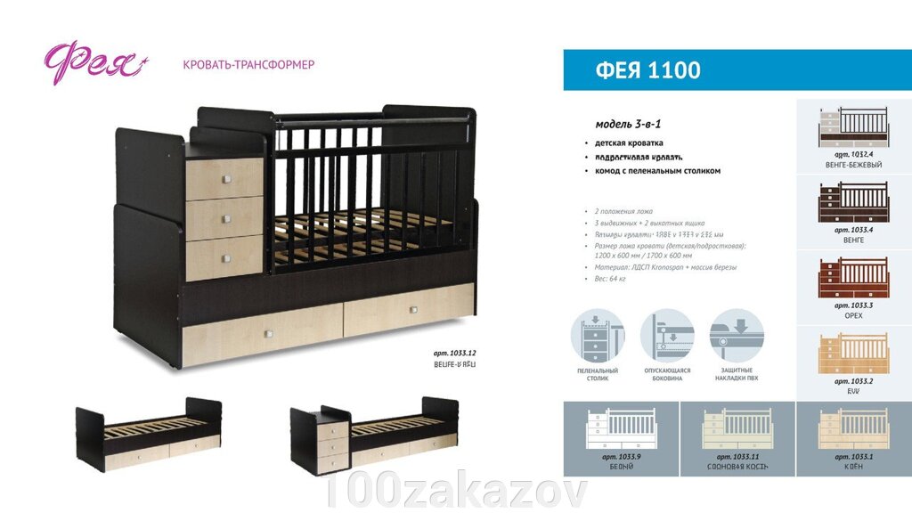 Кроватка для новорожденного. Кровать-трансформер детская Фея 1100. Детская кроватка.