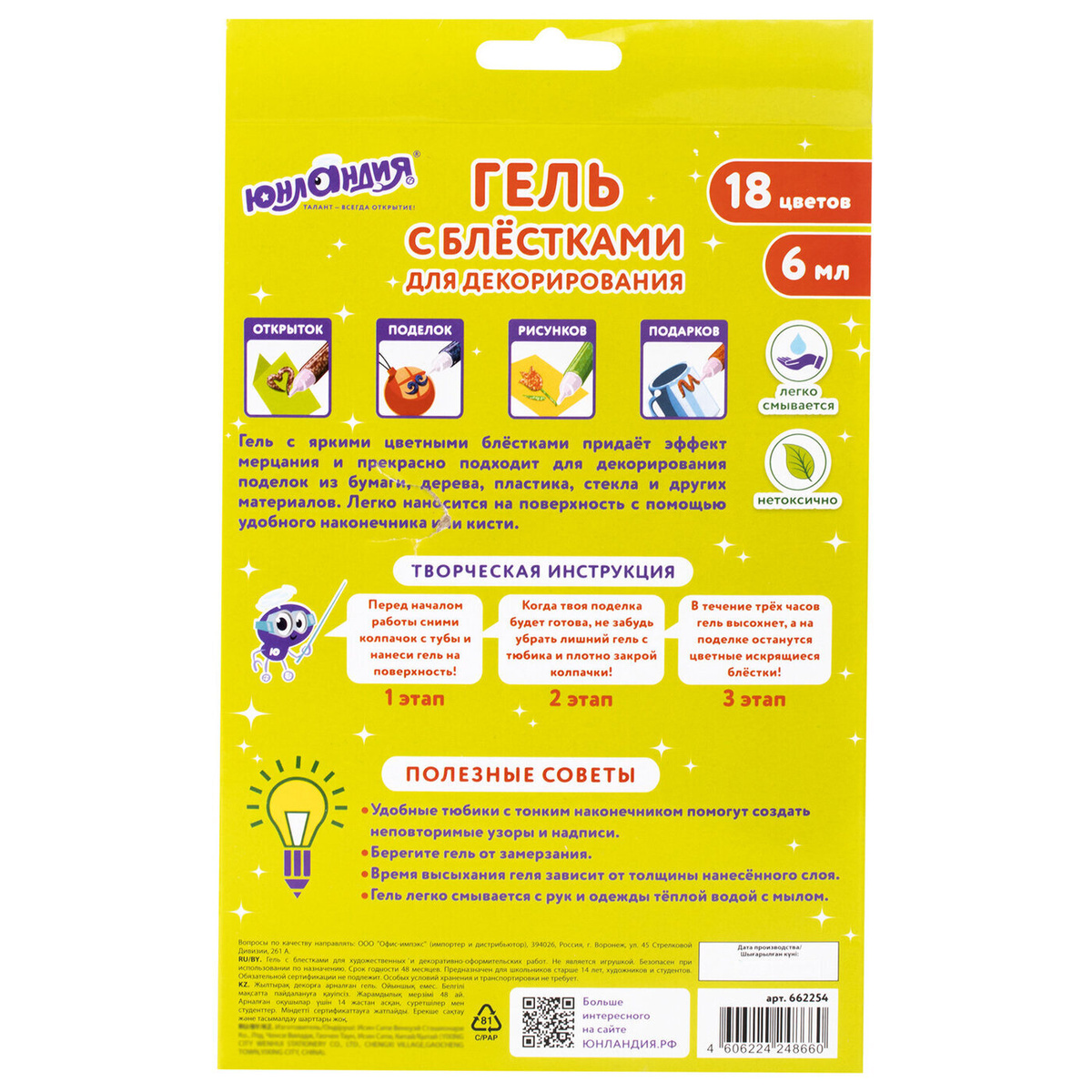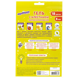 Гель с блестками Юнландия, для декора, поделок, DIY, творчества, оформления, 18 цветов ассорти по 6 мл, картонная упаковка