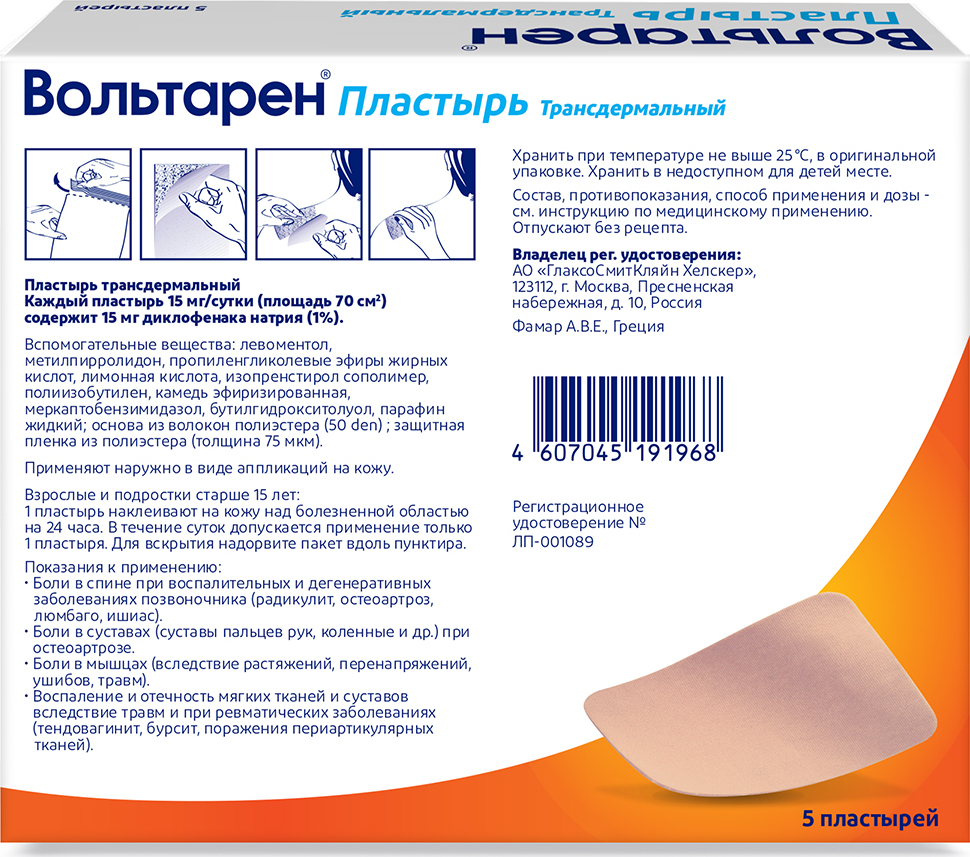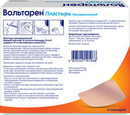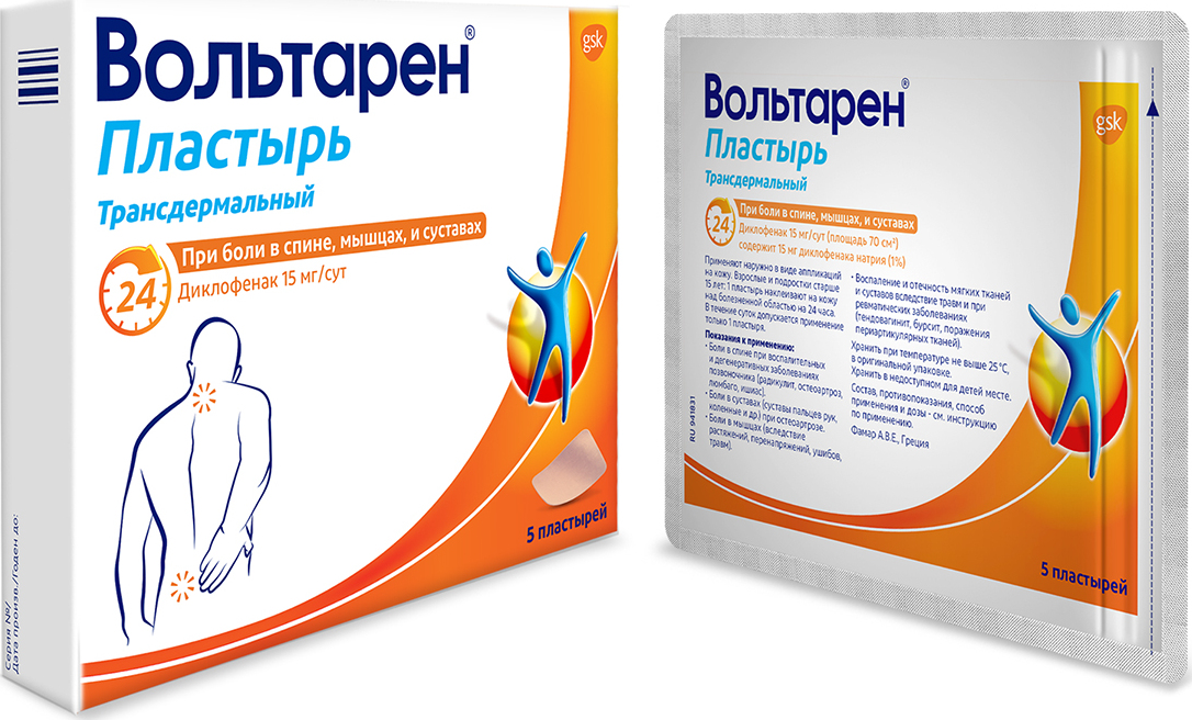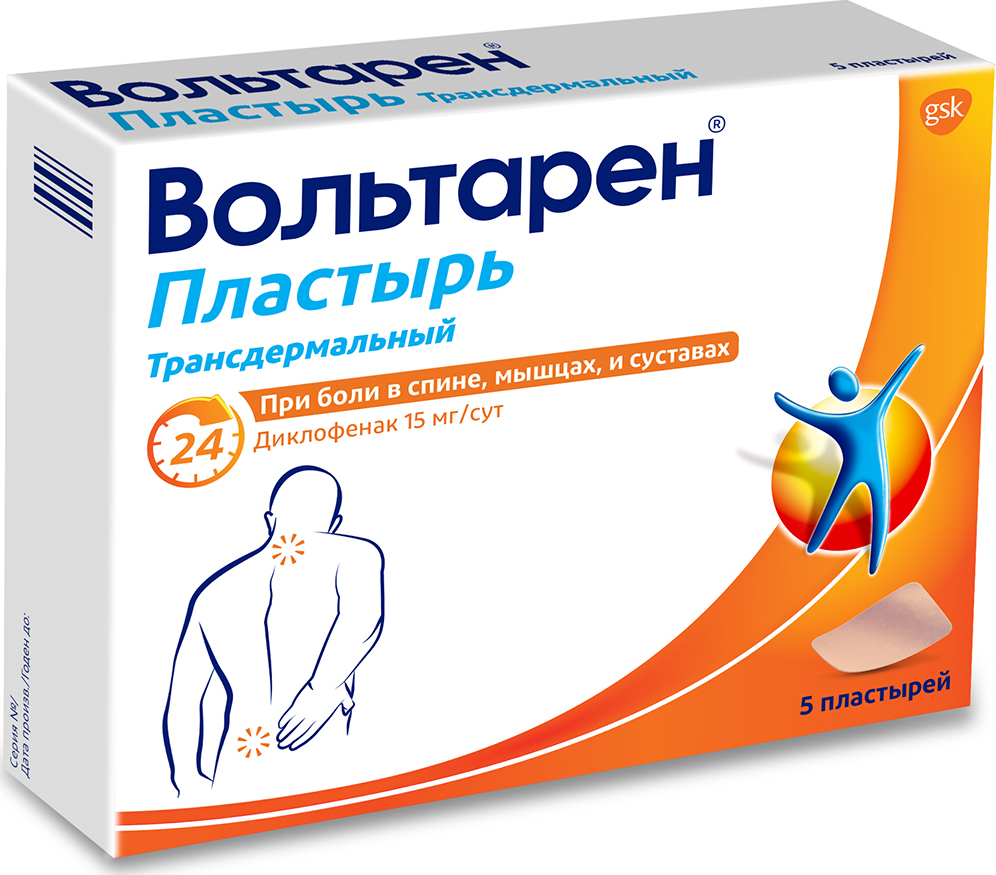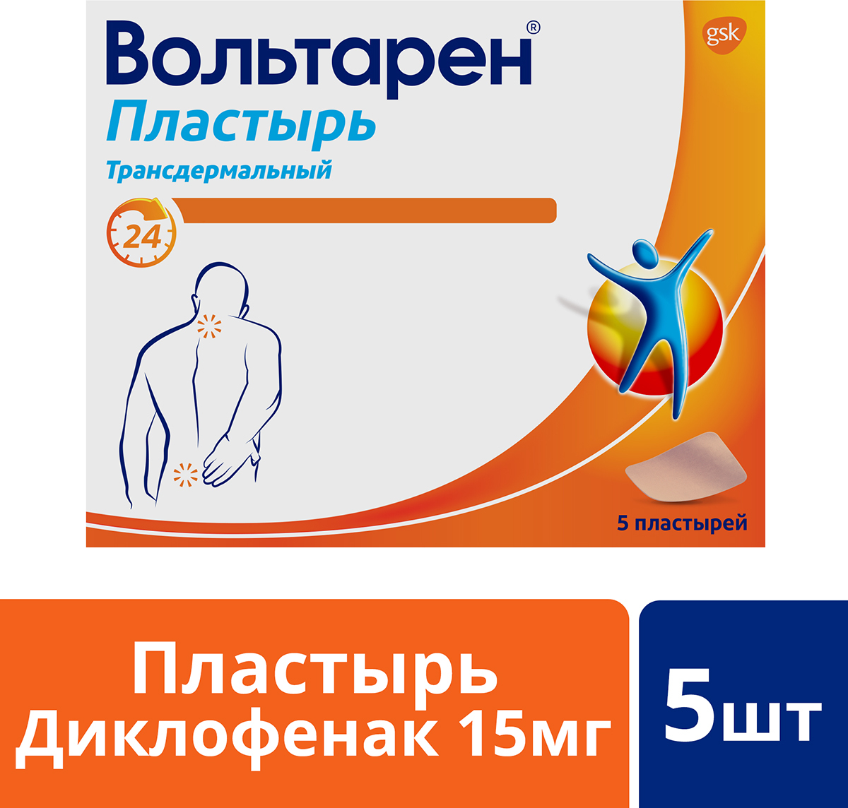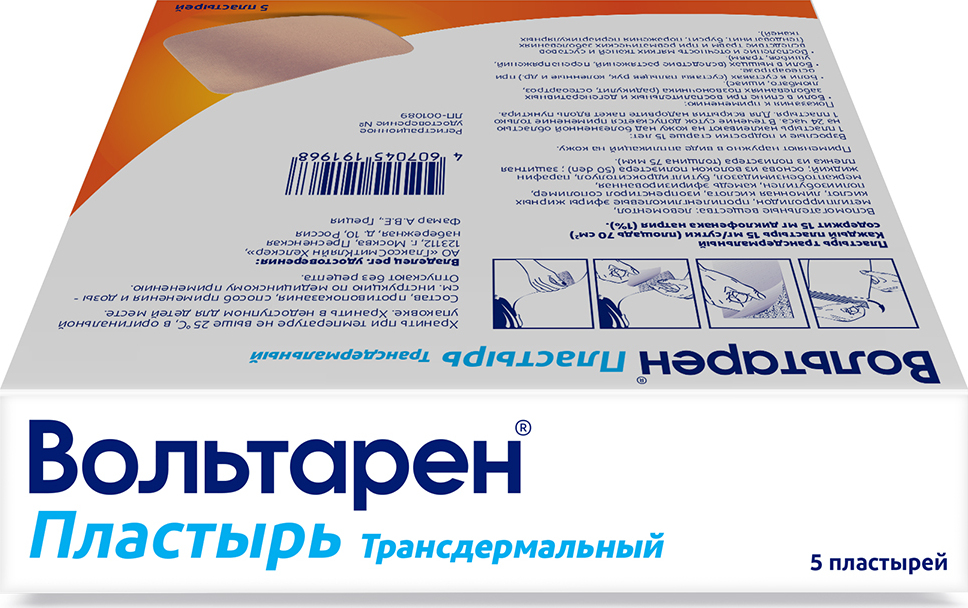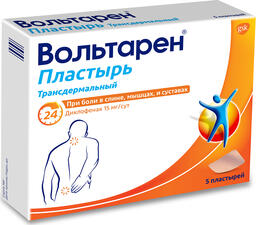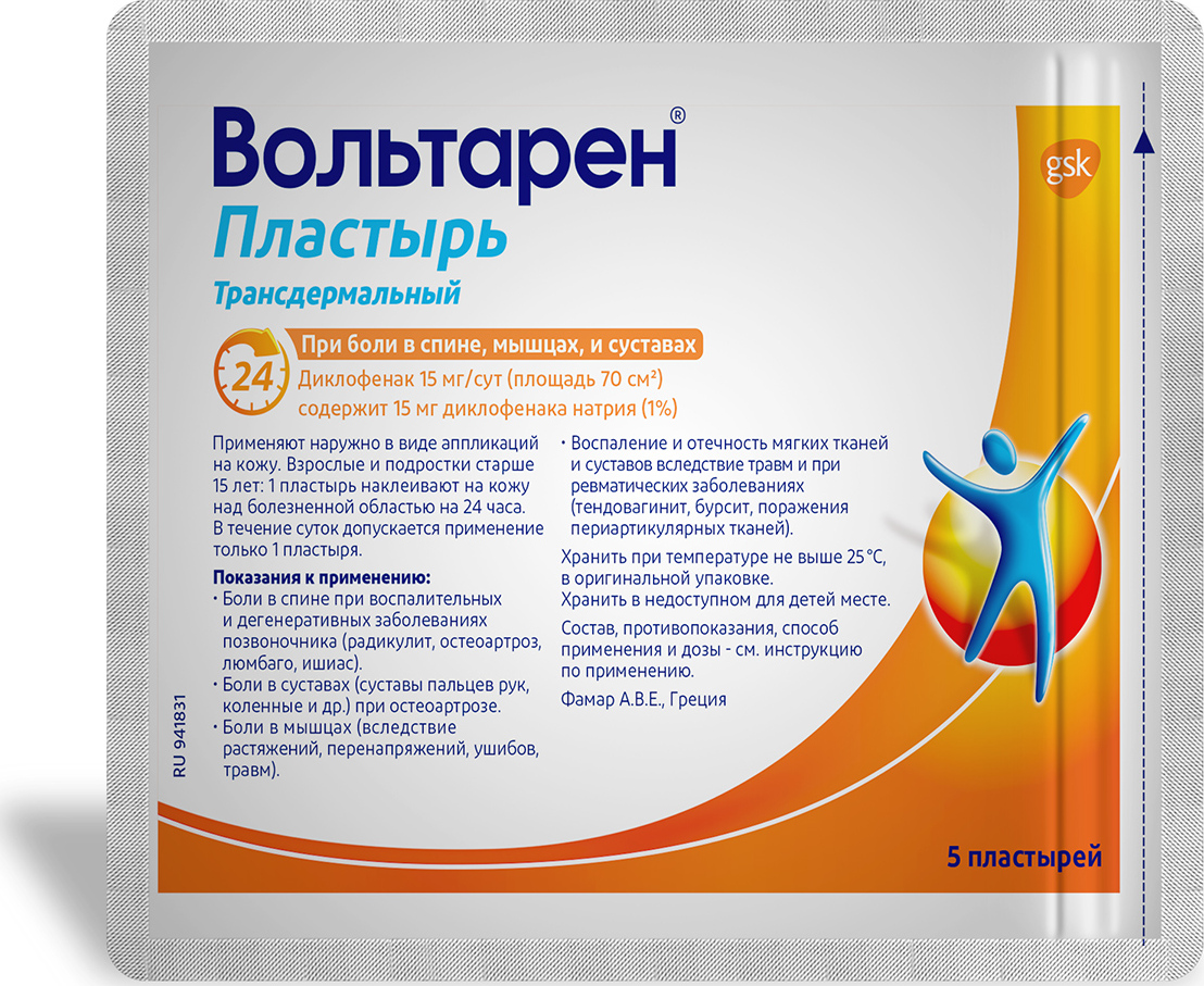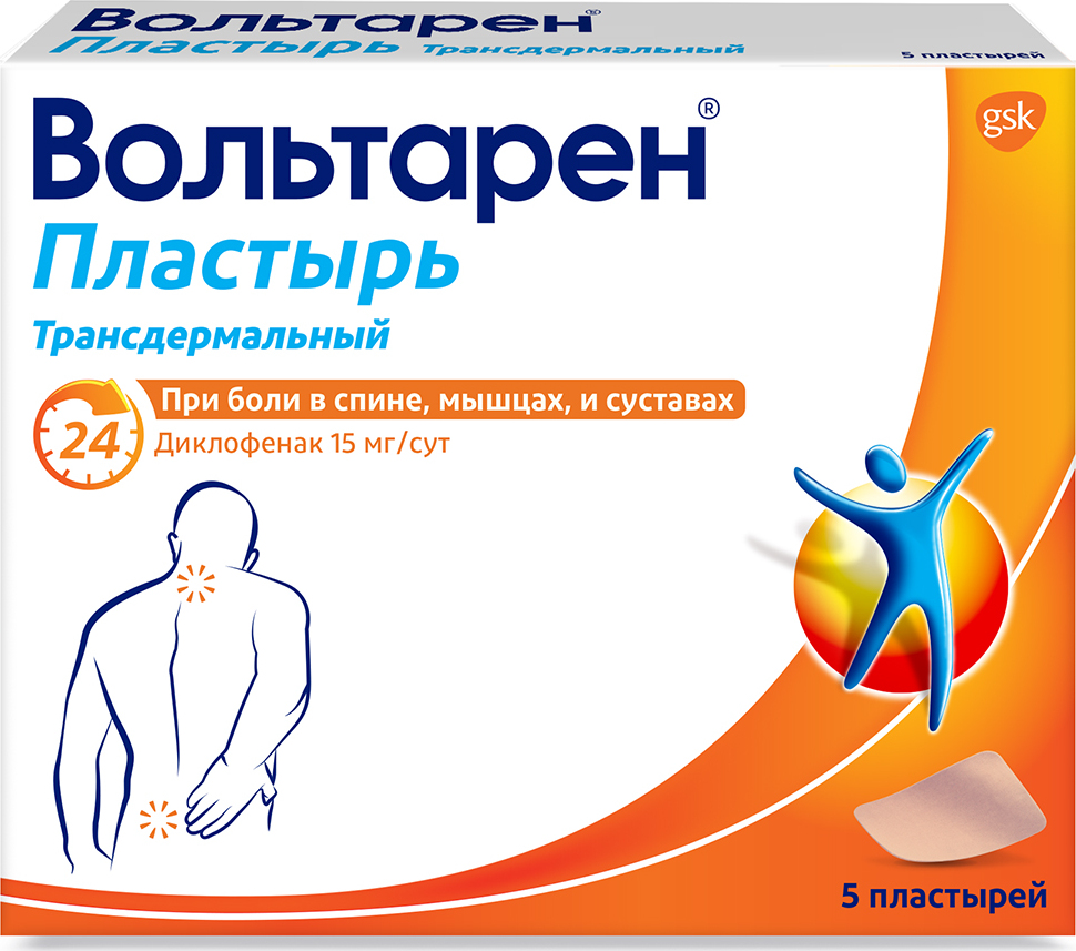 Вольтарен пластырь трансдермальный облегчает боли в спине, мышцах и суставах на 24 часа, 15 мг/сут, 5 шт.