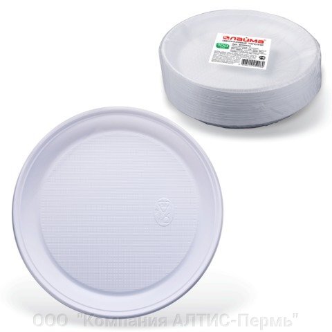Одноразовые тарелки плоские, КОМПЛЕКТ 100 шт., пластик, d=220 мм, БЮДЖЕТ, белые, ПС, холодное/горячее, LAIMA, 600943