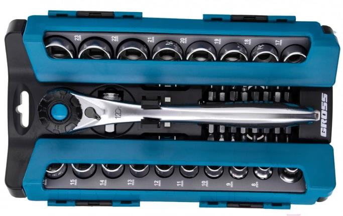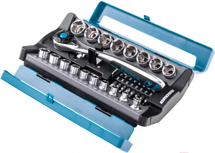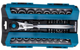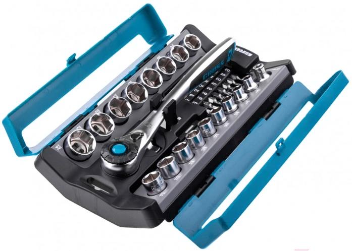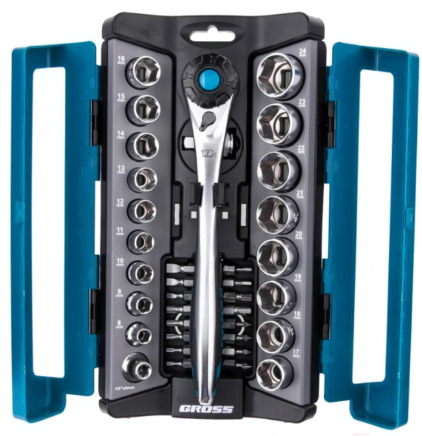 • Торцевые головки 1/2" (8 шт: 17-24 мм), 3/8" (9 шт: 8-16 мм)