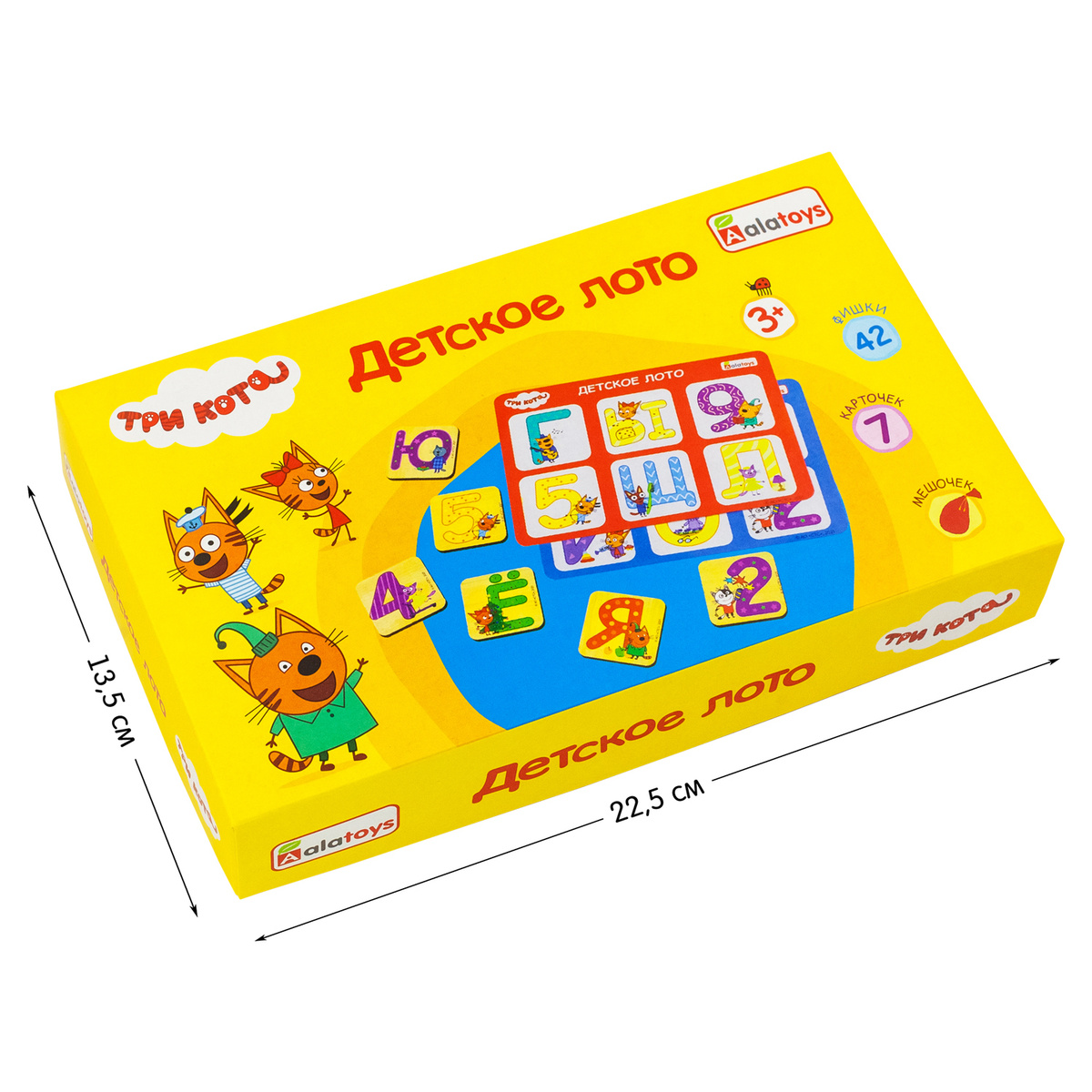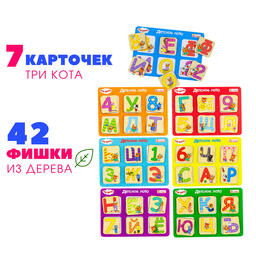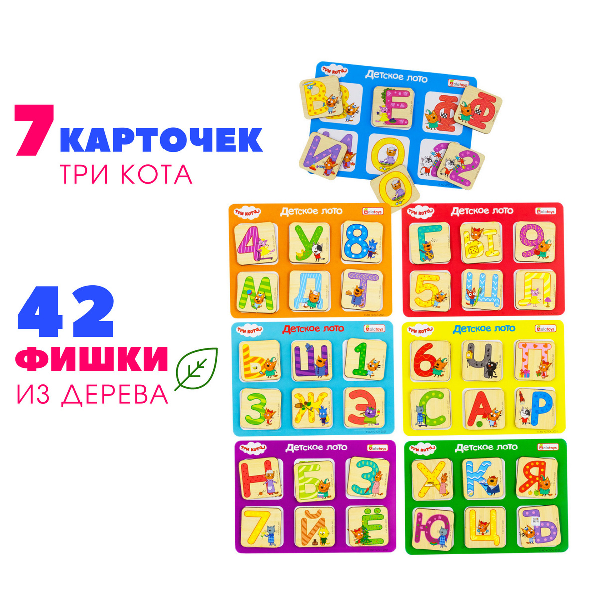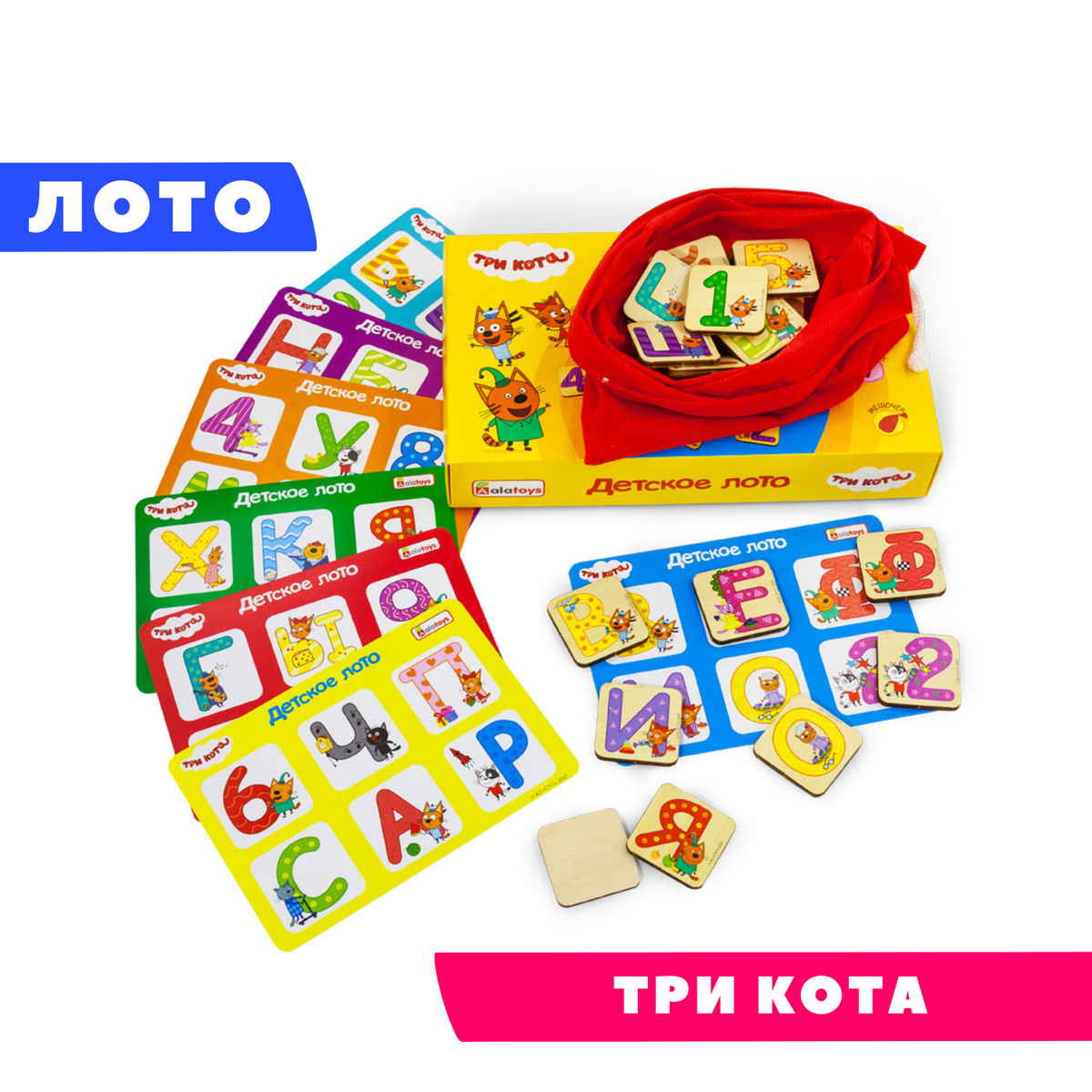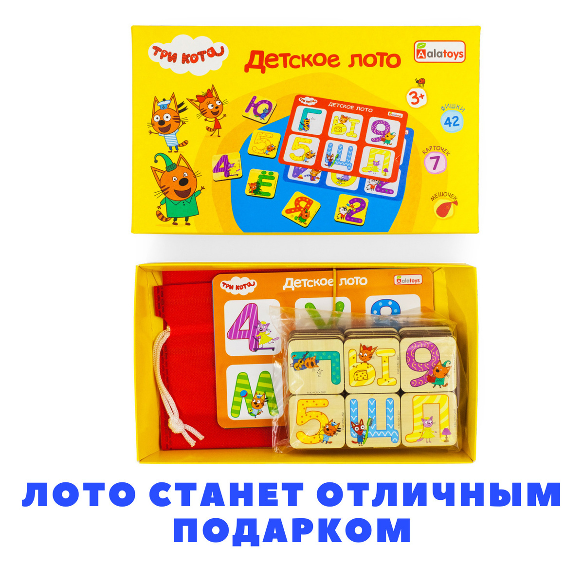 Настольные игры для детей ТРИ КОТА игрушки Лото детское русское для малышей IQ лото тактильное Alatoys 42 деревянные фишки, 7 карточек, мешочек