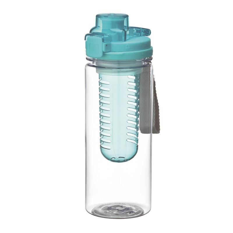 Бутылка с ситечком для фруктов объемом 800 мл. Размер: 7.8×7.8×25.6 см. Прозрачный корпус с ремешком. Крышка с ситечком из пластика бирюзового цвета.Рекомендована ручная чистка.Состав: пластик тритан.