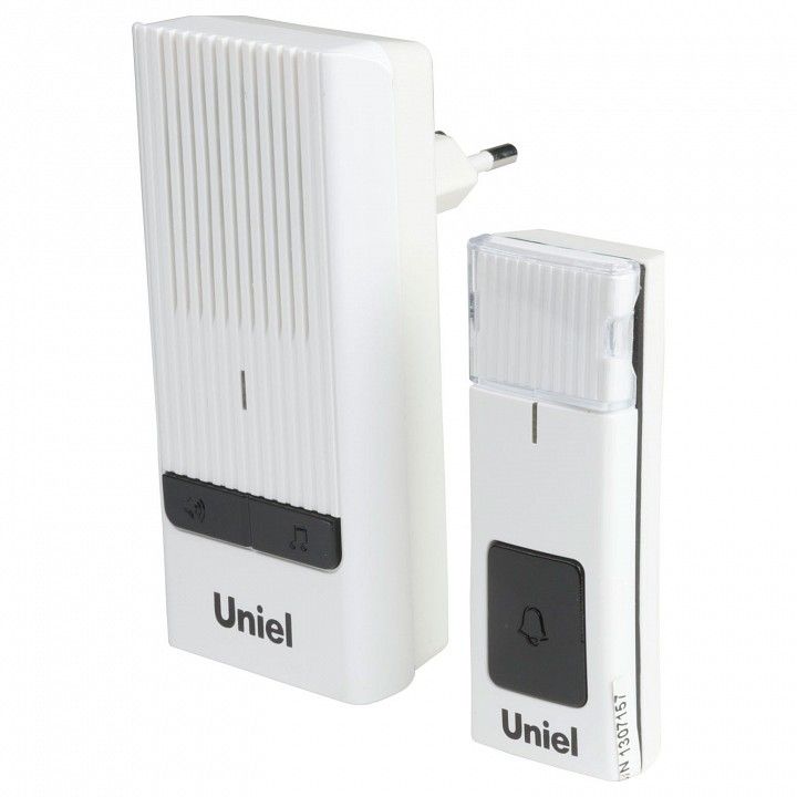 - Дополнительная информация Производитель Uniel. Необходимые компоненты - батарейка А23. Компоненты, входящие в комплект - провод электропитания с вилкой. Дополнительные параметры - количество мелодий - 32 шт., ,радиус действия - 150 м, 1 звонок, 1 кнопка. Светоотдача, лм/Вт -
