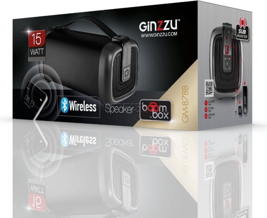 Колонка портативная беспроводная GINZZU GM-878B – влагозащищенная портативная bluetooth-колонка с FМ-радио, эквалайзером и сабвуфером. Возможно воспроизведение файлов с карты памяти или USB флэшки (максимальный объем 32 Гб). Встроенный Li-ion аккумулятор с возможностью проигрывания музыки до 6 ч.